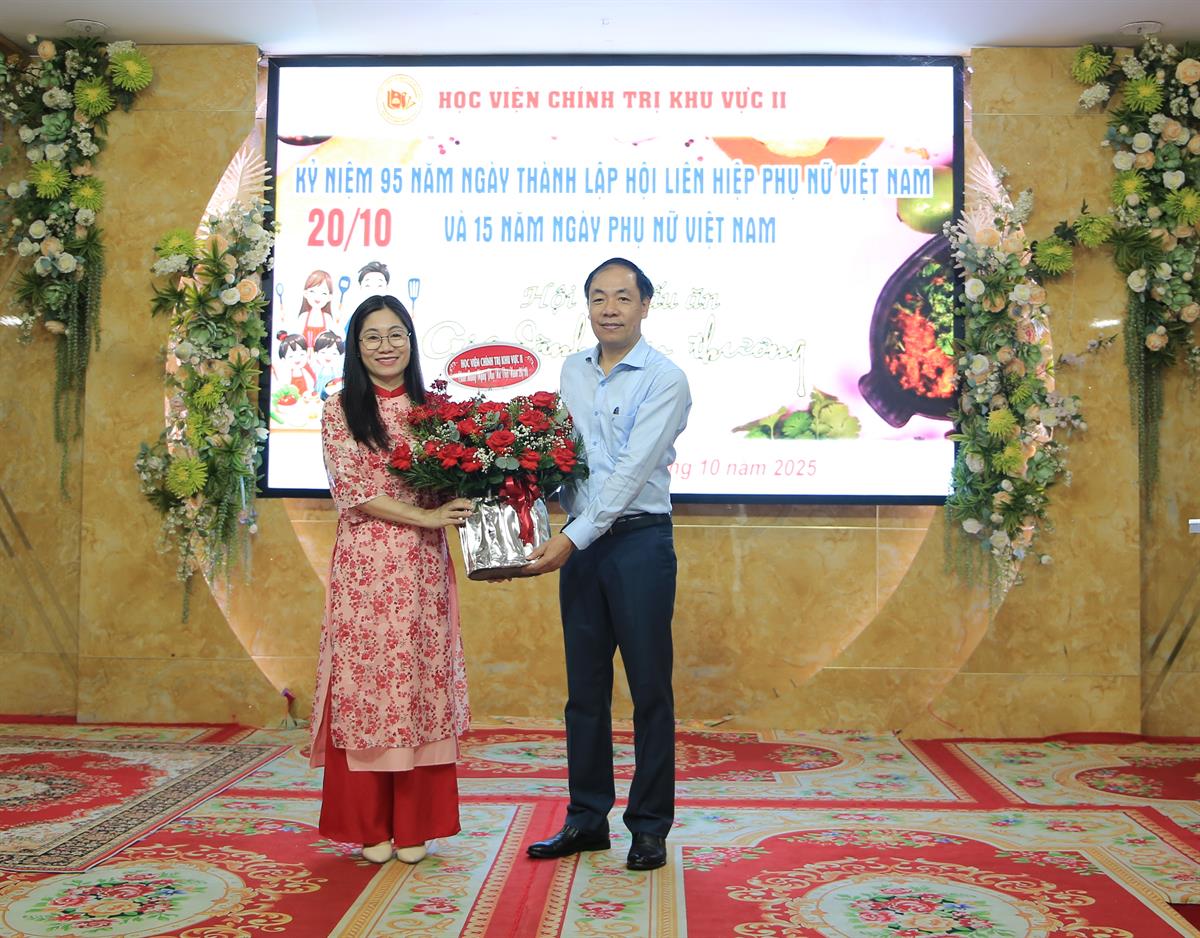 PGS, TS. Phạm Tất Thắng - Uỷ viên Ban Thường vụ Đảng uỷ, Phó Giám đốc Học viện Chính trị khu vực II tặng hoa chúc mừng PGS, TS. Nguyễn Thị Tuyết Mai - Phó Bí thư Đảng uỷ, Phó Giám đốc Học viện Chính trị khu vực II đại diện cho toàn thể nữ viên chức, người lao động Học viện Chính trị khu vực II