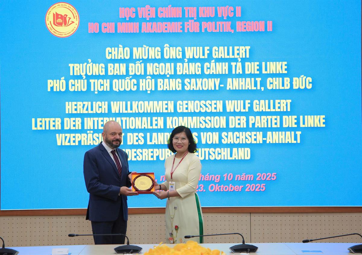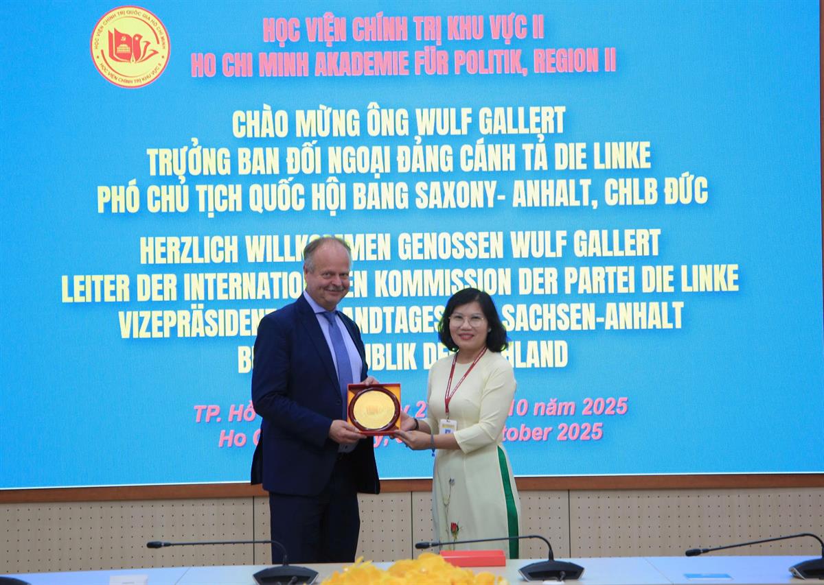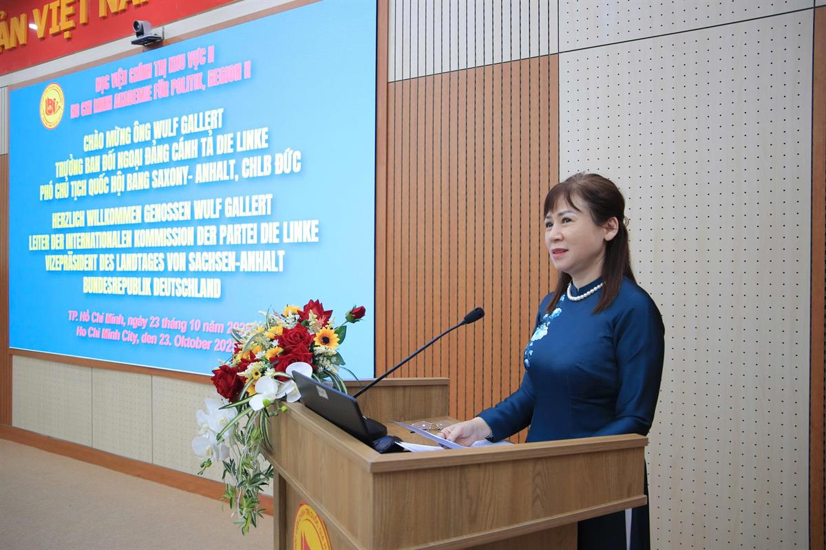 Phát biểu tại Buổi làm việc, TS. Lê Thị Anh Đào đã khái quát về chức năng, nhiệm vụ của Học viện Chính trị khu vực II - Học viện trực thuộc Học viện Chính trị quốc gia Hồ Chí Minh. Học viện là trung tâm đào tạo, bồi dưỡng đội ngũ cán bộ lãnh đạo, quản lý và cán bộ khoa học lý luận chính trị của Đảng và Nhà nước tại các tỉnh phía Nam. Đồng thời, Học viện cũng là cơ sở nghiên cứu khoa học về chủ nghĩa Mác - Lênin, tư tưởng Hồ Chí Minh, chủ trương, đường lối của Đảng, chính sách và pháp luật của Nhà nước; nghiên cứu các lĩnh vực khoa học chính trị, khoa học lãnh đạo, quản lý và khoa học hành chính. Những kết quả nghiên cứu này góp phần cung cấp luận cứ khoa học quan trọng cho việc hoạch định và hoàn thiện đường lối, chủ trương của Đảng, cũng như chính sách, pháp luật của Nhà nước trong sự nghiệp xây dựng và bảo vệ Tổ quốc. Điểm lại mối quan hệ hữu nghị, hợp tác giữa Việt Nam và Cộng hòa Liên bang Đức trong những năm gần đây, TS. Lê Thị Anh Đào nhắc lại chuyến thăm của Đoàn đại biểu cấp cao Đảng Cánh tả Đức trong năm 2024, hai Đảng đã tổ chức Đối thoại lần thứ năm. Trong đó, GS. Nguyễn Xuân Thắng, Ủy viên Bộ Chính trị, Giám đốc Học viện Chính trị quốc gia Hồ Chí Minh, Chủ tịch Hội đồng Lý luận Trung ương cũng đã tham dự đón tiếp Đoàn đại biểu cấp cao Đảng Cánh tả Đức. Do vậy, buổi làm việc ngày hôm nay sẽ góp phần làm sâu sắc hơn mối quan hệ giữa hai Đảng, hai nhà nước. Trong khuôn khổ nội dung buổi làm việc, TS. Lê Thị Anh Đào hy vọng sẽ nhận được nhiều chia sẻ, trao đổi thông tin hữu ích về quá trình cải cách hành chính của Đức trong bối cảnh chuyển đổi số. Từ đó, rút ra những giá trị tham khảo cho Việt Nam trong thời kỳ mới hiện nay, nhất là trong bối cảnh Việt Nam đang tiến hành sắp xếp tổ chức bộ máy và vận hành chính quyền địa phương hai cấp. Đồng thời, TS. Lê Thị Anh Đào bày tỏ mong muốn, thông qua chuyến công tác này, giữa Học viện Chính trị khu vực II với ông Wulf Gallert và Quỹ Rosa-Luxemburg khu vực Đông Nam Á sẽ có thêm nhiều hoạt động giao lưu, hợp tác, nghiên cứu khoa học.