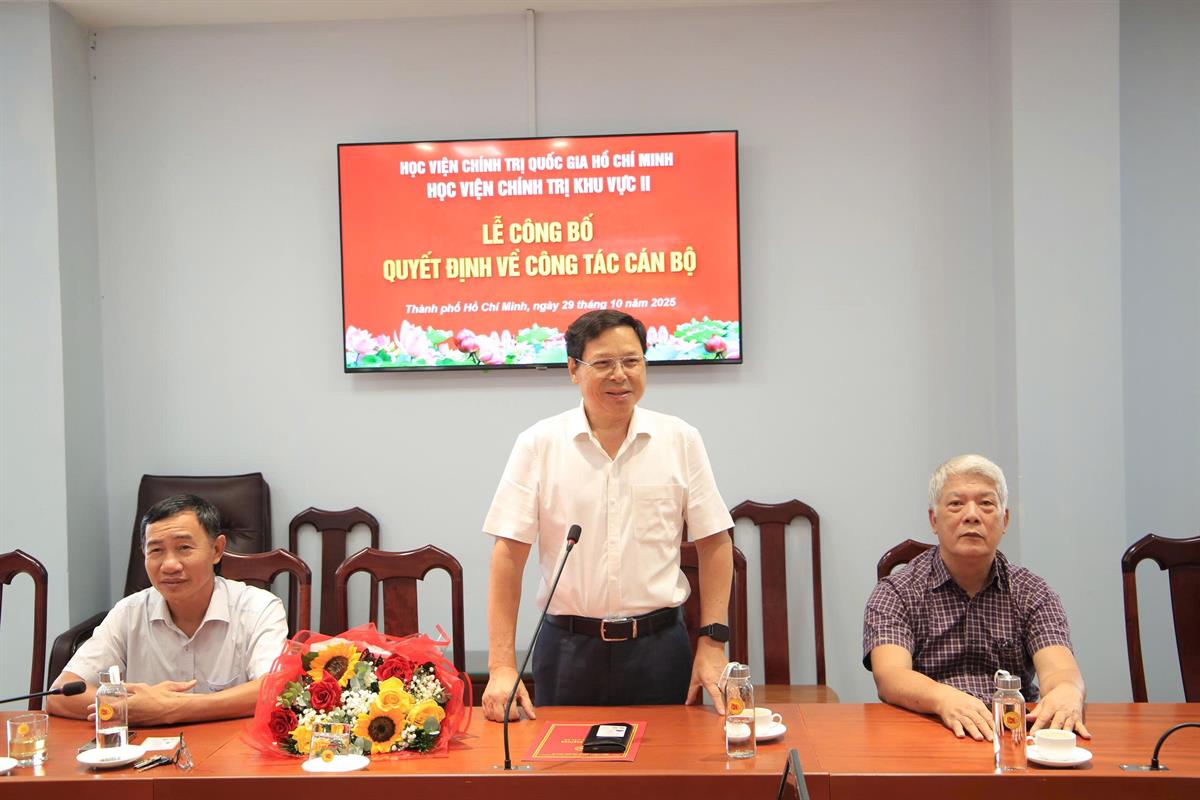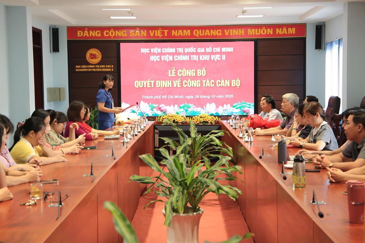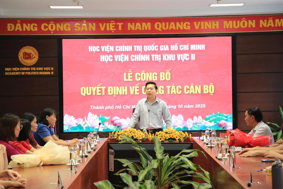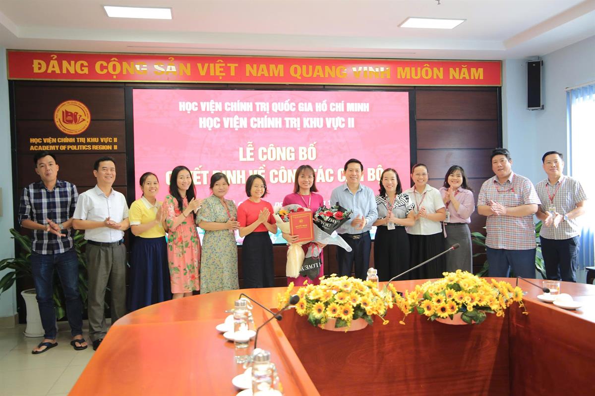 Thừa ủy quyền của Giám đốc Học viện Chính trị khu vực II, ThS. Nguyễn Thị Phương - Phó Trưởng Ban Tổ chức cán bộ đã công bố Quyết định về việc nghỉ hưu hưởng chế độ bảo hiểm xã hội đối với PGS, TS. Trần Minh Tuấn từ ngày 01/11/2025 và Quyết định bổ nhiệm lại chức danh Phó Trưởng Ban Quản lý khoa học và Hợp tác quốc tế đối với ThS. Dương Thị Phượng từ ngày 01/11/2025, thời gian giữ chức vụ bổ nhiệm là 05 năm.