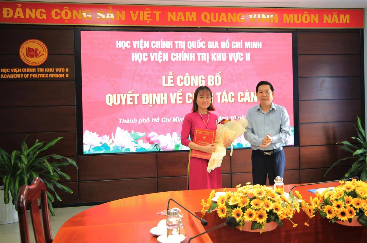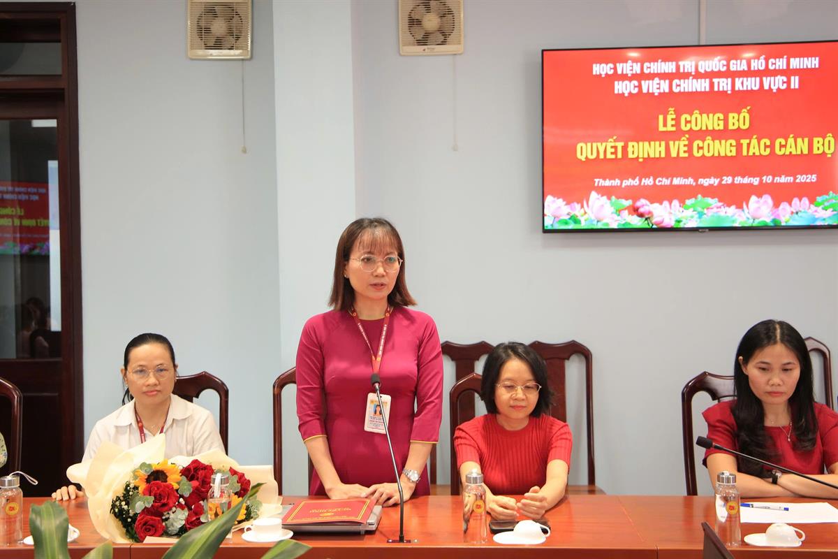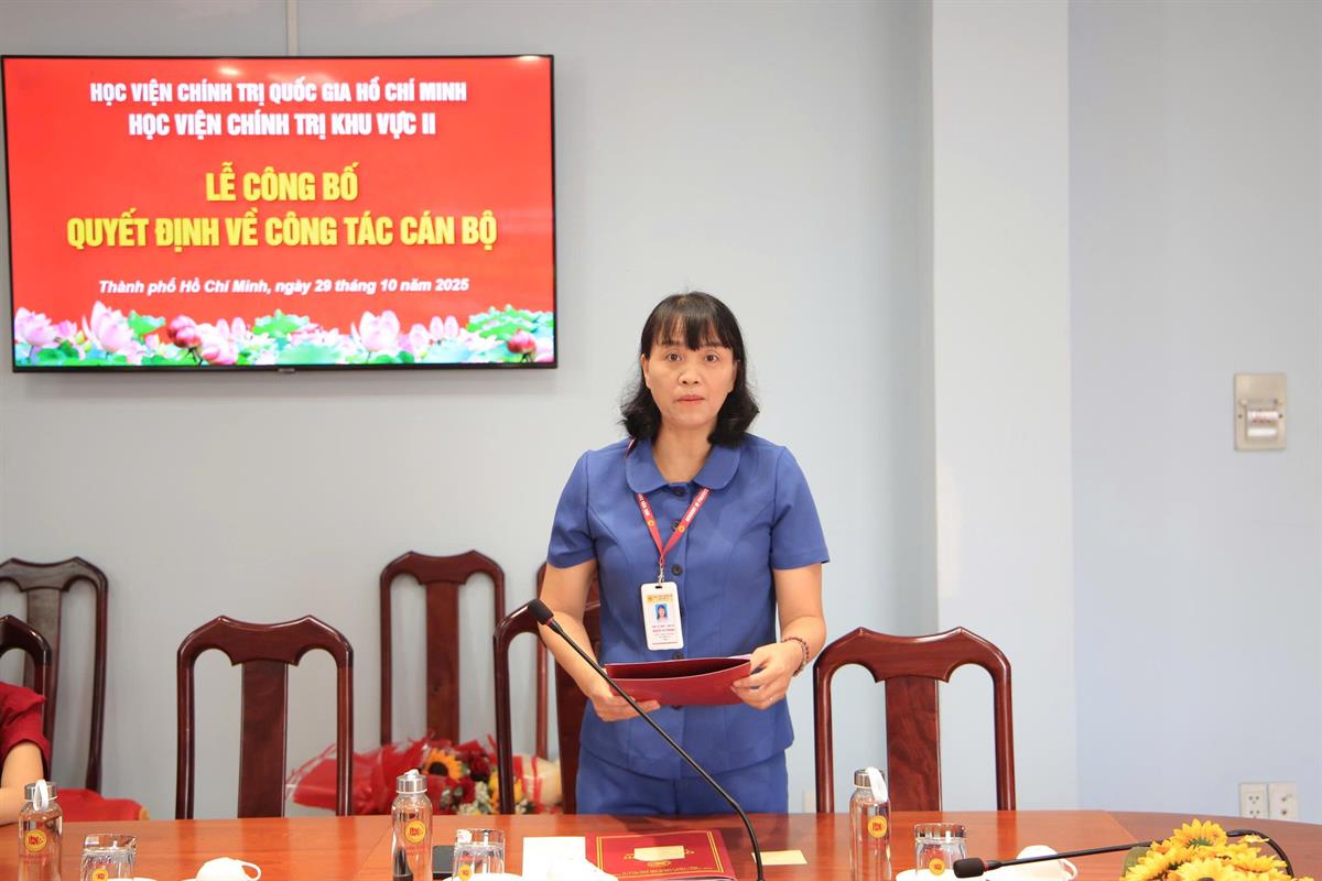 ThS. Nguyễn Thị Phương - Phó Trưởng Ban Tổ chức cán bộ Học viện Chính trị khu vực II công bố các quyết định