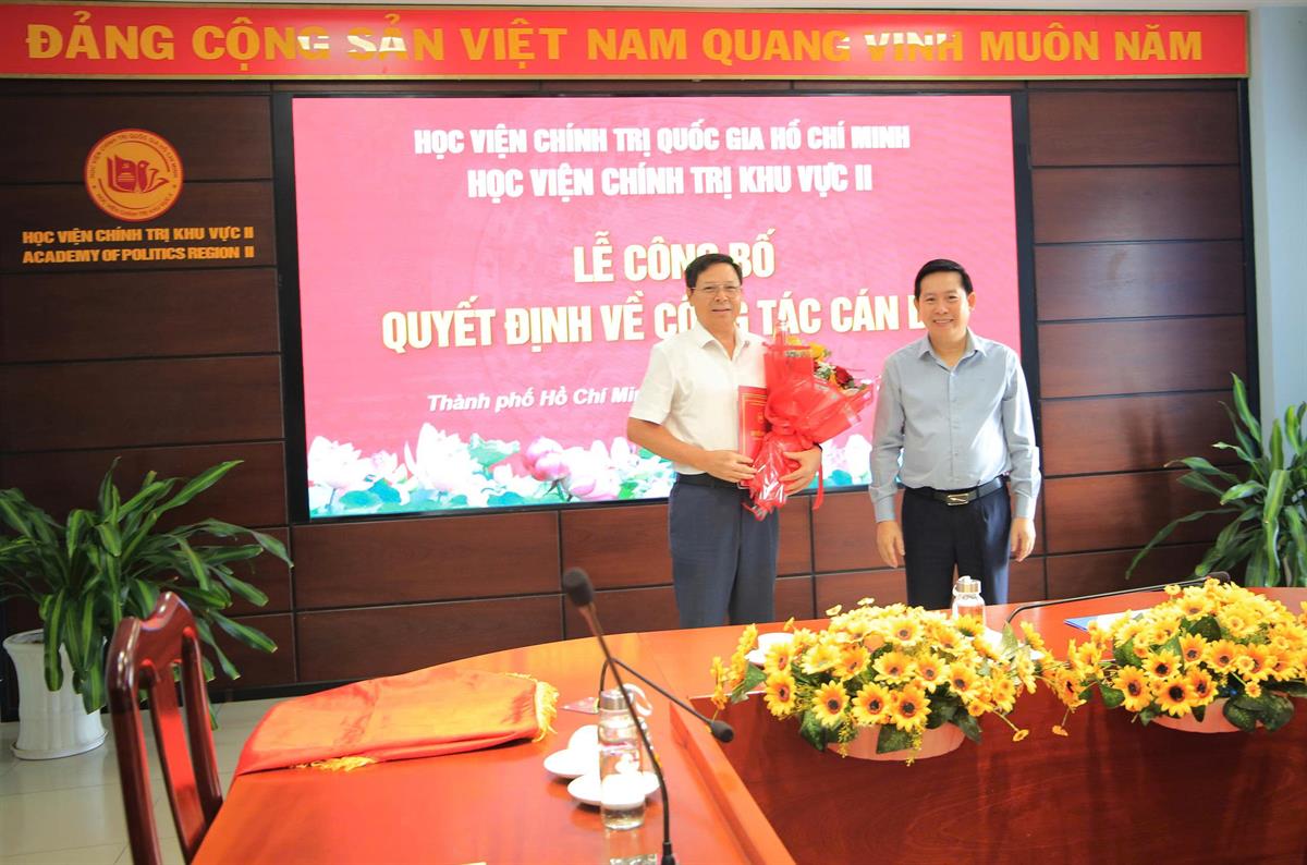 PGS, TS. Nguyễn Tấn Vinh - Ủy viên Ban Chấp hành Đảng bộ Học viện Chính trị quốc gia Hồ Chí Minh, Bí thư Đảng ủy, Giám đốc Học viện Chính trị khu vực II trao quyết định tới PGS, TS. Trần Minh Tuấn