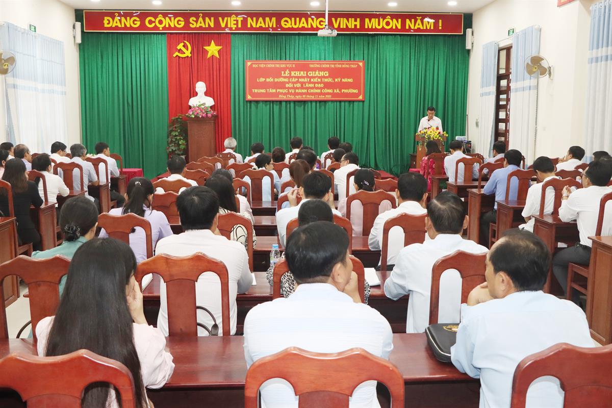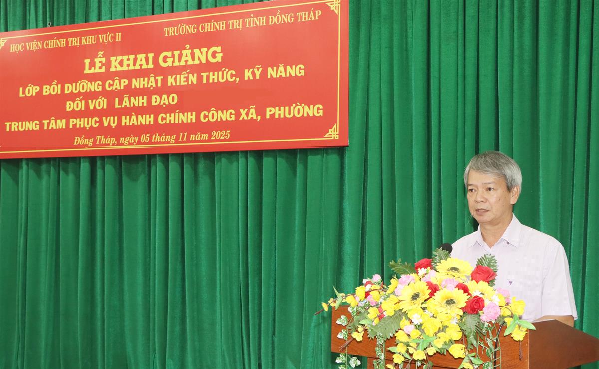 Sàng ngày 05/11/2025, tại Trường Chính trị tỉnh Đồng Tháp, Học viện Chính trị khu vực II phối hợp với Trường Chính trị tỉnh Đồng Tháp tổ chức Lễ khai giảng 02 lớp Bồi dưỡng cập nhật kiến thức, kỹ năng đối với lãnh đạo Trung tâm phục vụ hành chính công xã, phường.