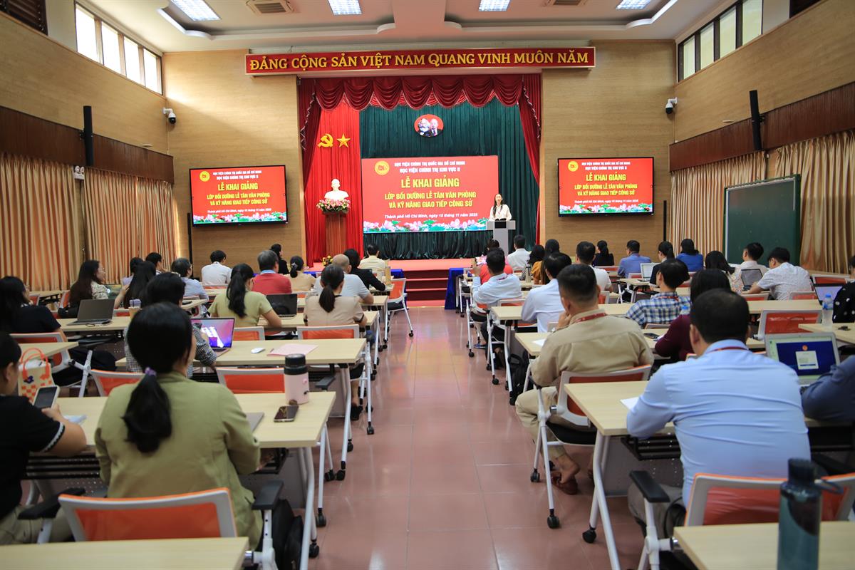 Phát biểu tại Lễ khai giảng PGS, TS. Nguyễn Tấn Vinh nhấn mạnh, lớp học diễn ra trong bối cảnh cả nước đang xây dựng nền hành chính hiện đại, chuyên nghiệp. Trong bối cảnh đó, năng lực hoạt động của một tổ chức không chỉ thể hiện ở trình độ chuyên môn mà còn thể hiện ở lễ tân ngoại giao. Thông qua hoạt động giao tiếp, có thể đánh giá con người, năng lực và văn hóa của một cơ quan, tổ chức. PGS, TS. Nguyễn Tấn Vinh khẳng định, lớp bồi dưỡng được tổ chức với các mục tiêu: Một là, chuyển tải được những kiến thức cơ bản đến giảng viên, viên chức, người lao động làm nền tảng để biến thành hành động vận dụng vào thực tiễn trong giao tiếp công sở, giữa thầy, cô giáo với nhau, giữa thầy, cô giáo với đội ngũ lãnh đạo quản lý, giữa thầy, cô giáo với học viên. Hai là, hình thành văn hóa giao tiếp công sở đặc trưng của Trường Đảng - Học viện Chính trị khu vực II.