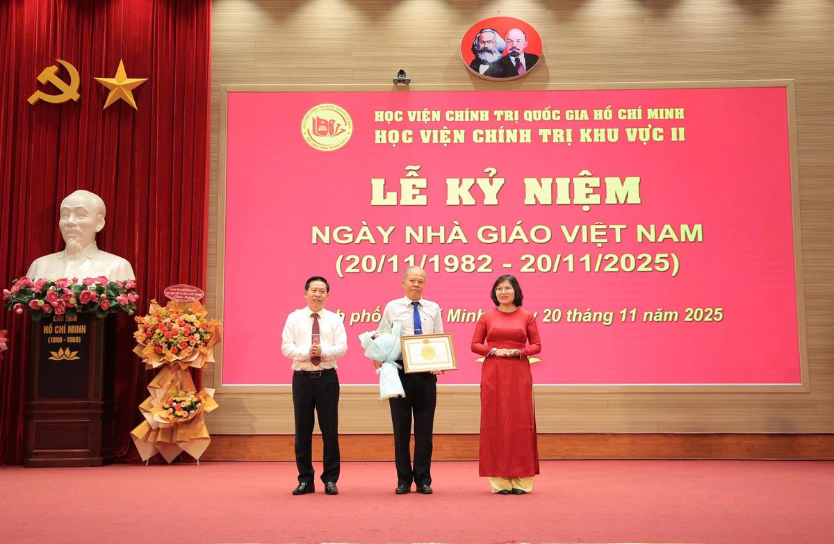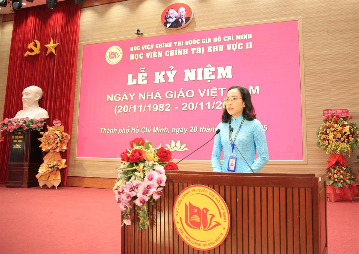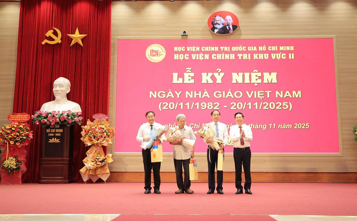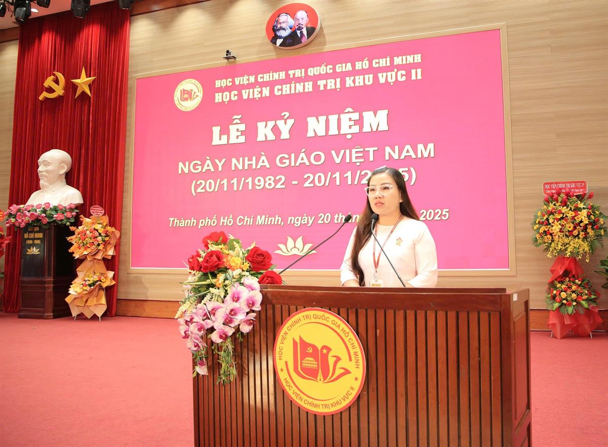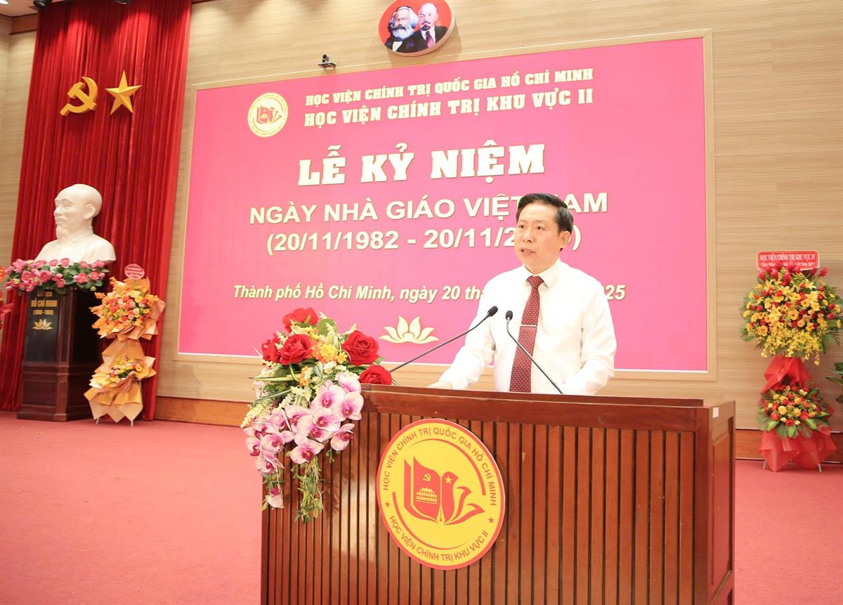 Tiếp theo là Lễ kỷ niệm 43 năm kỷ niệm Ngày Nhà giáo Việt Nam. Trong diễn văn tại Lễ kỷ niệm, PGS, TS. Nguyễn Tấn Vinh chia sẻ, ngày 20/11 không chỉ là dịp tôn vinh nghề dạy học nói chung, mà còn là dịp để tri ân những người đã góp phần gìn giữ, vun đắp và lan tỏa giá trị của văn hóa trường Đảng; cùng nhìn lại hành trình phấn đấu, hy sinh, lặng lẽ nhưng bền bỉ của đội ngũ nhà giáo trong sự nghiệp đào tạo, bồi dưỡng cán bộ cho Đảng và hệ thống chính trị. Chủ tịch Hồ Chí Minh đặc biệt coi trọng công tác huấn luyện cán bộ và khẳng định đó là “công việc gốc của Đảng”. Mỗi lần Người đến thăm và làm việc với Trường Đảng Nguyễn Ái Quốc là mỗi lần Người để lại những chỉ dẫn sâu sắc, giàu tính thời đại. Đặc biệt, trong lần thăm Trường năm 1949, Bác đã ghi vào Sổ vàng truyền thống những lời bất hủ: Học để làm việc, làm người, làm cán bộ; Học để phụng sự Đoàn thể, phụng sự giai cấp và nhân dân, phụng sự Tổ quốc và nhân loại. Những lời dạy giản dị mà sâu sắc ấy đã trở thành nền tảng tư tưởng, là sợi chỉ đỏ dẫn dắt toàn bộ công tác đào tạo, bồi dưỡng cán bộ của Đảng suốt hơn bảy thập kỷ qua. Đối với Học viện Chính trị khu vực II, lời dặn của Chủ tịch Hồ Chí Minh còn là lời nhắc nhở trách nhiệm của mỗi giảng viên: mỗi bài giảng, giờ giảng, công trình nghiên cứu khoa học không chỉ truyền tải tri thức, mà còn góp phần bồi đắp bản lĩnh chính trị, phẩm chất đạo đức cho đội ngũ cán bộ. Tự hào với vị thế là “Trường Đảng miền Nam”, Học viện Chính trị khu vực II luôn bám sát sự lãnh đạo, chỉ đạo của Học viện Chính trị quốc gia Hồ Chí Minh; luôn khẳng định vị thế là trung tâm đào tạo, bồi dưỡng và nghiên cứu lý luận chính trị quan trọng của khu vực phía Nam và cả nước. Những năm qua, chất lượng đào tạo, bồi dưỡng của Học viện tiếp tục được nâng cao. Đội ngũ giảng viên từng bước được trẻ hóa, có bản lĩnh chính trị vững vàng, có nền tảng khoa học bài bản, gắn bó với thực tiễn, tâm huyết với nghề, tích cực đổi mới nội dung, phương pháp giảng dạy; gắn lý luận với thực tiễn, vận dụng sáng tạo chủ nghĩa Mác - Lênin, tư tưởng Hồ Chí Minh và đường lối của Đảng vào từng bài giảng, từng chuyên đề. Cùng với hoạt động giảng dạy, các thầy, cô giáo tích cực nghiên cứu khoa học lý luận chính trị, tổng kết thực tiễn, góp phần làm sáng tỏ nhiều vấn đề mới, khó, phức tạp của công cuộc đổi mới và hội nhập quốc tế; cung cấp cơ sở khoa học cho việc hoạch định, hoàn thiện đường lối, chủ trương, chính sách của Đảng và Nhà nước, nhất là ở các địa phương khu vực phía Nam. Mỗi công trình nghiên cứu đều là kết tinh của trí tuệ, tâm huyết và trách nhiệm của các nhà giáo Học viện. Nhiều thế hệ học viên của Học viện đã trưởng thành, đảm nhiệm những vị trí quan trọng trong các cơ quan của Đảng, Nhà nước, Mặt trận Tổ quốc và các đoàn thể chính trị - xã hội. Sự phát triển của cán bộ in đậm dấu ấn của các thầy giáo, cô giáo Học viện, những người thắp lửa tri thức, rèn luyện bản lĩnh, hun đúc lý tưởng và phẩm chất chính trị cho học viên.