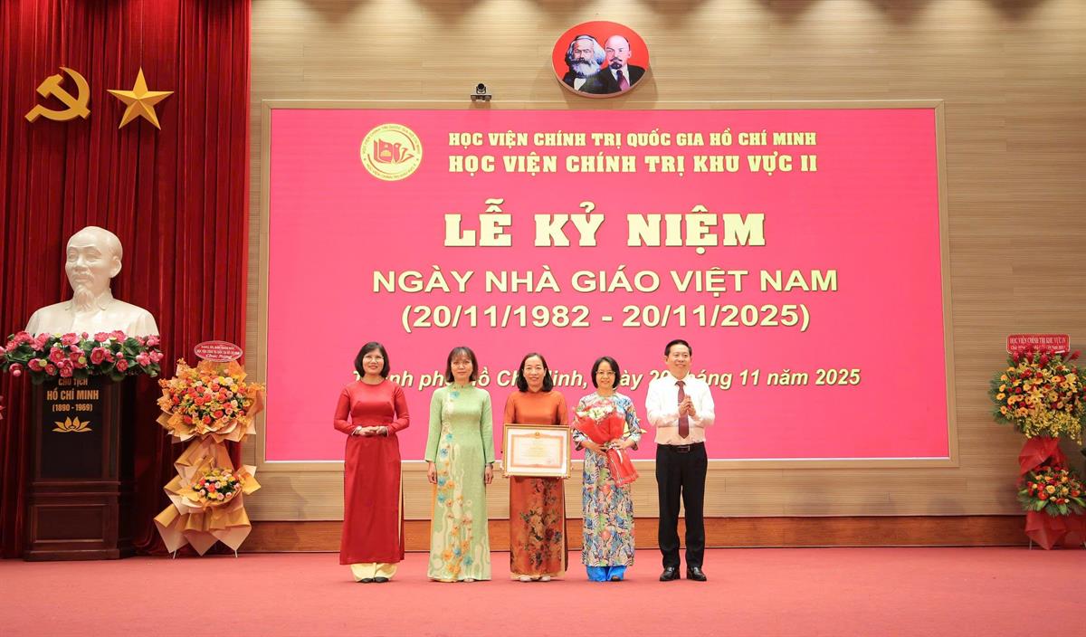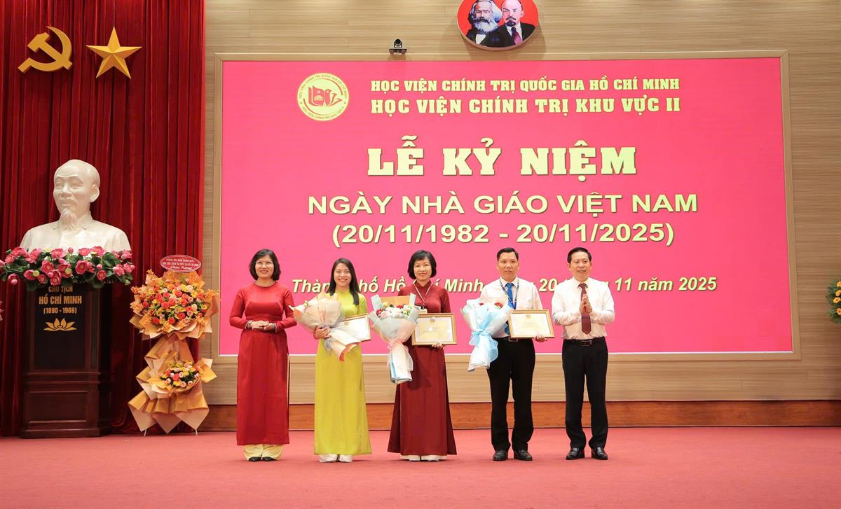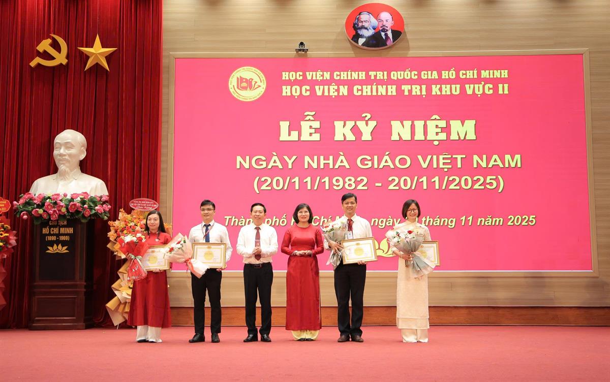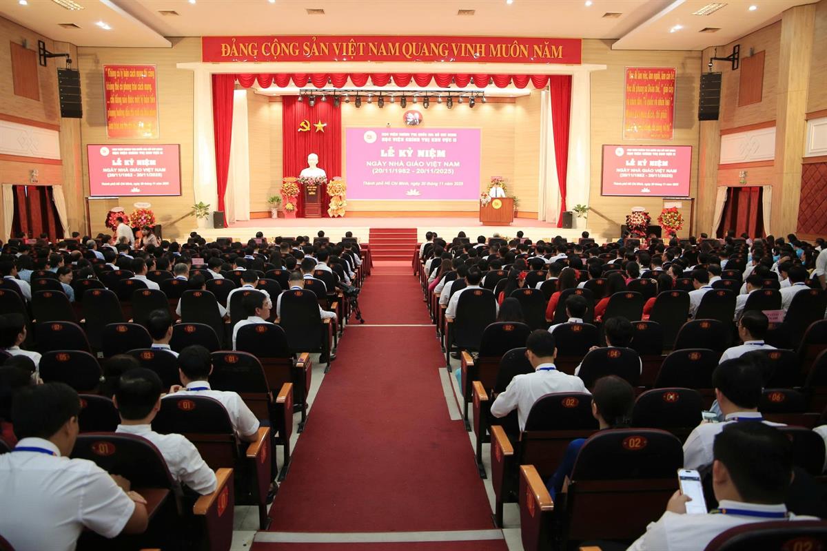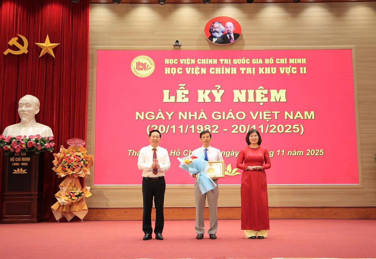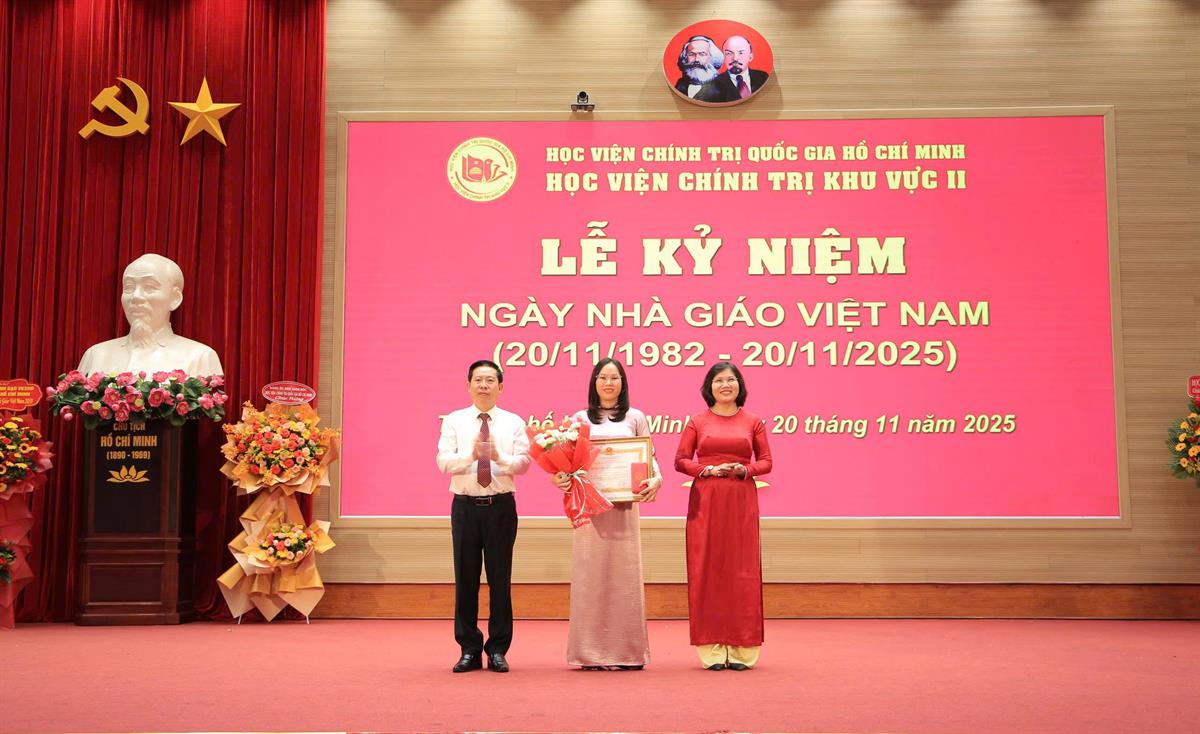 Tiếp theo là Lễ kỷ niệm 43 năm kỷ niệm Ngày Nhà giáo Việt Nam. Trong diễn văn tại Lễ kỷ niệm, PGS, TS. Nguyễn Tấn Vinh chia sẻ, ngày 20/11 không chỉ là dịp tôn vinh nghề dạy học nói chung, mà còn là dịp để tri ân những người đã góp phần gìn giữ, vun đắp và lan tỏa giá trị của văn hóa trường Đảng; cùng nhìn lại hành trình phấn đấu, hy sinh, lặng lẽ nhưng bền bỉ của đội ngũ nhà giáo trong sự nghiệp đào tạo, bồi dưỡng cán bộ cho Đảng và hệ thống chính trị. Chủ tịch Hồ Chí Minh đặc biệt coi trọng công tác huấn luyện cán bộ và khẳng định đó là “công việc gốc của Đảng”. Mỗi lần Người đến thăm và làm việc với Trường Đảng Nguyễn Ái Quốc là mỗi lần Người để lại những chỉ dẫn sâu sắc, giàu tính thời đại. Đặc biệt, trong lần thăm Trường năm 1949, Bác đã ghi vào Sổ vàng truyền thống những lời bất hủ: Học để làm việc, làm người, làm cán bộ; Học để phụng sự Đoàn thể, phụng sự giai cấp và nhân dân, phụng sự Tổ quốc và nhân loại. Những lời dạy giản dị mà sâu sắc ấy đã trở thành nền tảng tư tưởng, là sợi chỉ đỏ dẫn dắt toàn bộ công tác đào tạo, bồi dưỡng cán bộ của Đảng suốt hơn bảy thập kỷ qua. Đối với Học viện Chính trị khu vực II, lời dặn của Chủ tịch Hồ Chí Minh còn là lời nhắc nhở trách nhiệm của mỗi giảng viên: mỗi bài giảng, giờ giảng, công trình nghiên cứu khoa học không chỉ truyền tải tri thức, mà còn góp phần bồi đắp bản lĩnh chính trị, phẩm chất đạo đức cho đội ngũ cán bộ. Tự hào với vị thế là “Trường Đảng miền Nam”, Học viện Chính trị khu vực II luôn bám sát sự lãnh đạo, chỉ đạo của Học viện Chính trị quốc gia Hồ Chí Minh; luôn khẳng định vị thế là trung tâm đào tạo, bồi dưỡng và nghiên cứu lý luận chính trị quan trọng của khu vực phía Nam và cả nước. Những năm qua, chất lượng đào tạo, bồi dưỡng của Học viện tiếp tục được nâng cao. Đội ngũ giảng viên từng bước được trẻ hóa, có bản lĩnh chính trị vững vàng, có nền tảng khoa học bài bản, gắn bó với thực tiễn, tâm huyết với nghề, tích cực đổi mới nội dung, phương pháp giảng dạy; gắn lý luận với thực tiễn, vận dụng sáng tạo chủ nghĩa Mác - Lênin, tư tưởng Hồ Chí Minh và đường lối của Đảng vào từng bài giảng, từng chuyên đề. Cùng với hoạt động giảng dạy, các thầy, cô giáo tích cực nghiên cứu khoa học lý luận chính trị, tổng kết thực tiễn, góp phần làm sáng tỏ nhiều vấn đề mới, khó, phức tạp của công cuộc đổi mới và hội nhập quốc tế; cung cấp cơ sở khoa học cho việc hoạch định, hoàn thiện đường lối, chủ trương, chính sách của Đảng và Nhà nước, nhất là ở các địa phương khu vực phía Nam. Mỗi công trình nghiên cứu đều là kết tinh của trí tuệ, tâm huyết và trách nhiệm của các nhà giáo Học viện. Nhiều thế hệ học viên của Học viện đã trưởng thành, đảm nhiệm những vị trí quan trọng trong các cơ quan của Đảng, Nhà nước, Mặt trận Tổ quốc và các đoàn thể chính trị - xã hội. Sự phát triển của cán bộ in đậm dấu ấn của các thầy giáo, cô giáo Học viện, những người thắp lửa tri thức, rèn luyện bản lĩnh, hun đúc lý tưởng và phẩm chất chính trị cho học viên.