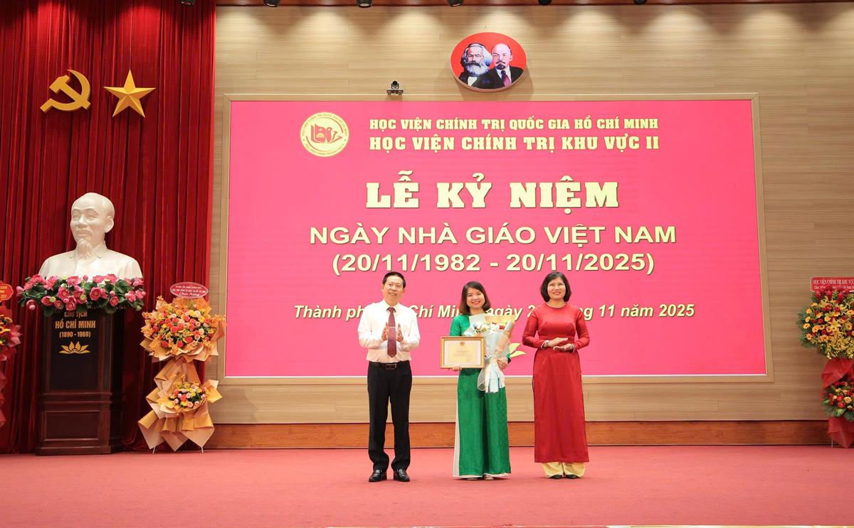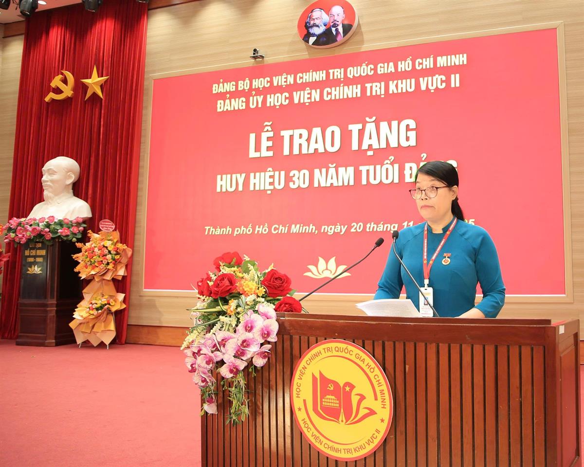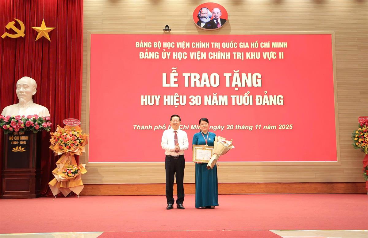 Trong khuôn khổ các sự kiện diễn ra ngày 20/11/2025, Đảng ủy Học viện Chính trị khu vực II đã tổ chức Lễ trao Huy hiệu 30 năm tuổi Đảng cho đồng chí Nguyễn Thị Hoa Phượng, Bí thư Chi bộ, Trưởng Khoa Lịch sử Đảng. Cùng tham dự buổi Lễ có sự hiện diện của: PGS, TS. Vũ Tuấn Hưng - Viện trưởng Viện Khoa học xã hội vùng Nam Bộ; TS. Võ Thành Khối - Nguyên Giám đốc Học viện Chính trị khu vực II; toàn thể viên chức, người lao động và học viên các lớp Cao cấp lý luận chính trị hệ tập trung từ lớp K76.A01 đến lớp K76.A12, khoá học 2025 - 2026.