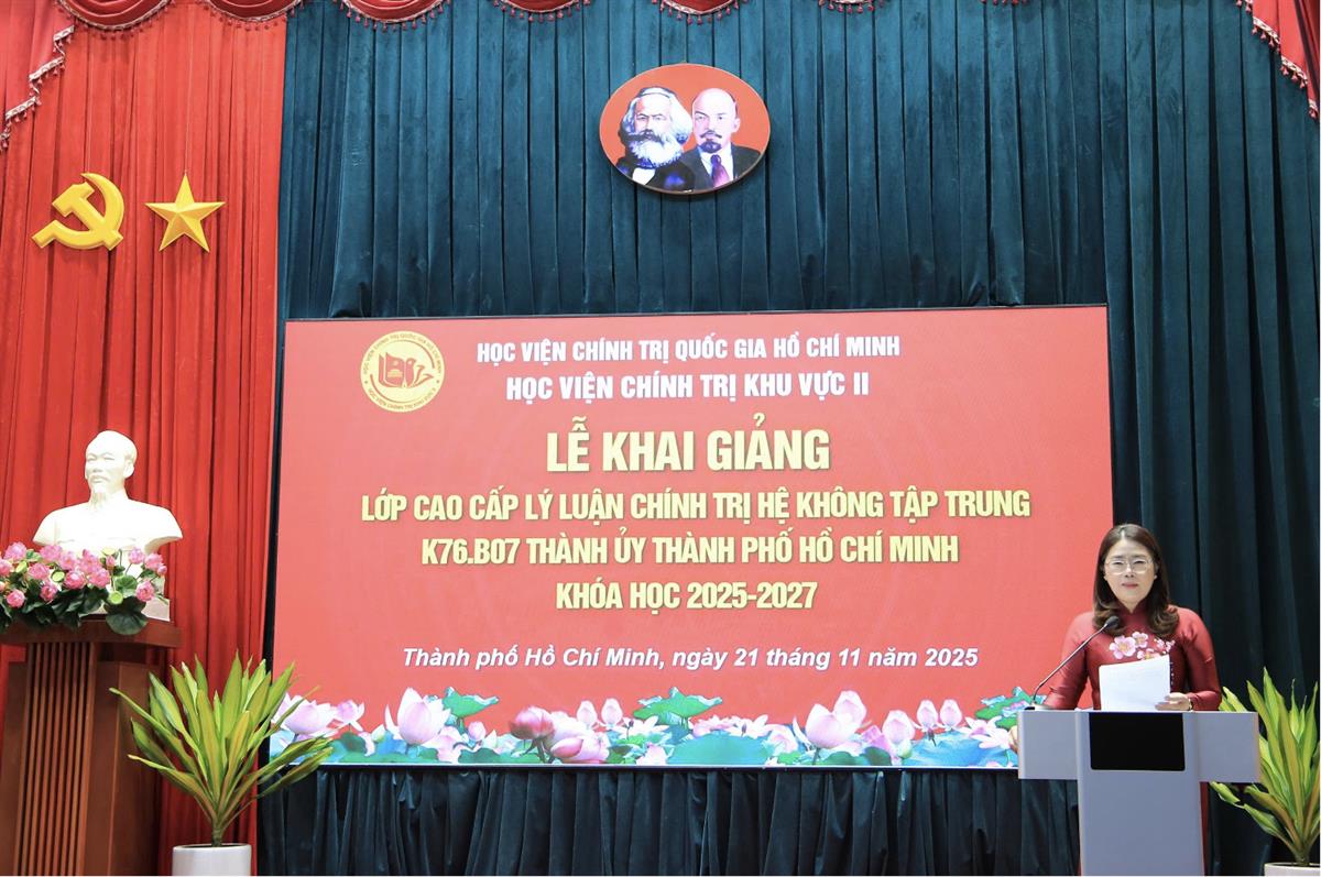 Phát biểu tại Lễ khai giảng, PGS, TS. Nguyễn Tấn Vinh nhấn mạnh, đây là khóa học đầu tiên diễn ra sau khi sáp nhập hai tỉnh Bình Dương và Bà Rịa - Vũng Tàu về đưa Thành phố Hồ Chí Minh và trở thành một siêu đô thị với nhiều yêu cầu phát triển mới. Sự thay đổi này không chỉ làm chuyển biến diện mạo Thành phố, mà còn đòi hỏi sự đổi mới tư duy và phương thức quản lý. Vì vậy, nhiệm vụ đào tạo và bồi dưỡng đội ngũ cán bộ lãnh đạo, quản lý đáp ứng yêu cầu mới trong giai đoạn hiện nay mang ý nghĩa quan trọng. Chương trình Cao cấp lý luận chính trị gồm 19 học phần  trang bị cho học viên hệ thống tri thức cốt lõi về chủ nghĩa Mác - Lênin, tư tưởng Hồ Chí Minh, đường lối của Đảng cùng chính sách, pháp luật của Nhà nước. Đồng thời, chương trình tích hợp kiến thức về kinh tế, pháp luật, môi trường, tâm lý và các kỹ năng lãnh đạo, quản lý, giúp học viên xây dựng thế giới quan khoa học, bản lĩnh chính trị vững vàng và thái độ đúng đắn khi xử lý các vấn đề thực tiễn. Đây cũng là dịp để học viên hệ thống hóa toàn diện những nội dung học tập, từ đó nâng cao năng lực phục vụ công tác tại cơ sở. PGS, TS. Nguyễn Tấn Vinh đề nghị, mỗi học viên cần bố trí hài hòa giữa công việc chuyên môn và nhiệm vụ học tập, xác định rõ mục tiêu, phương pháp và thái độ học tập phù hợp. Bên cạnh đó, học viên phải rèn luyện tinh thần tự học, tự nghiên cứu nhằm nâng cao tư duy độc lập; đồng thời việc thực hiện nghiêm nội quy, quy chế đào tạo của Học viện Chính trị khu vực II là yêu cầu bắt buộc để bảo đảm tính kỷ luật và hiệu quả học tập.