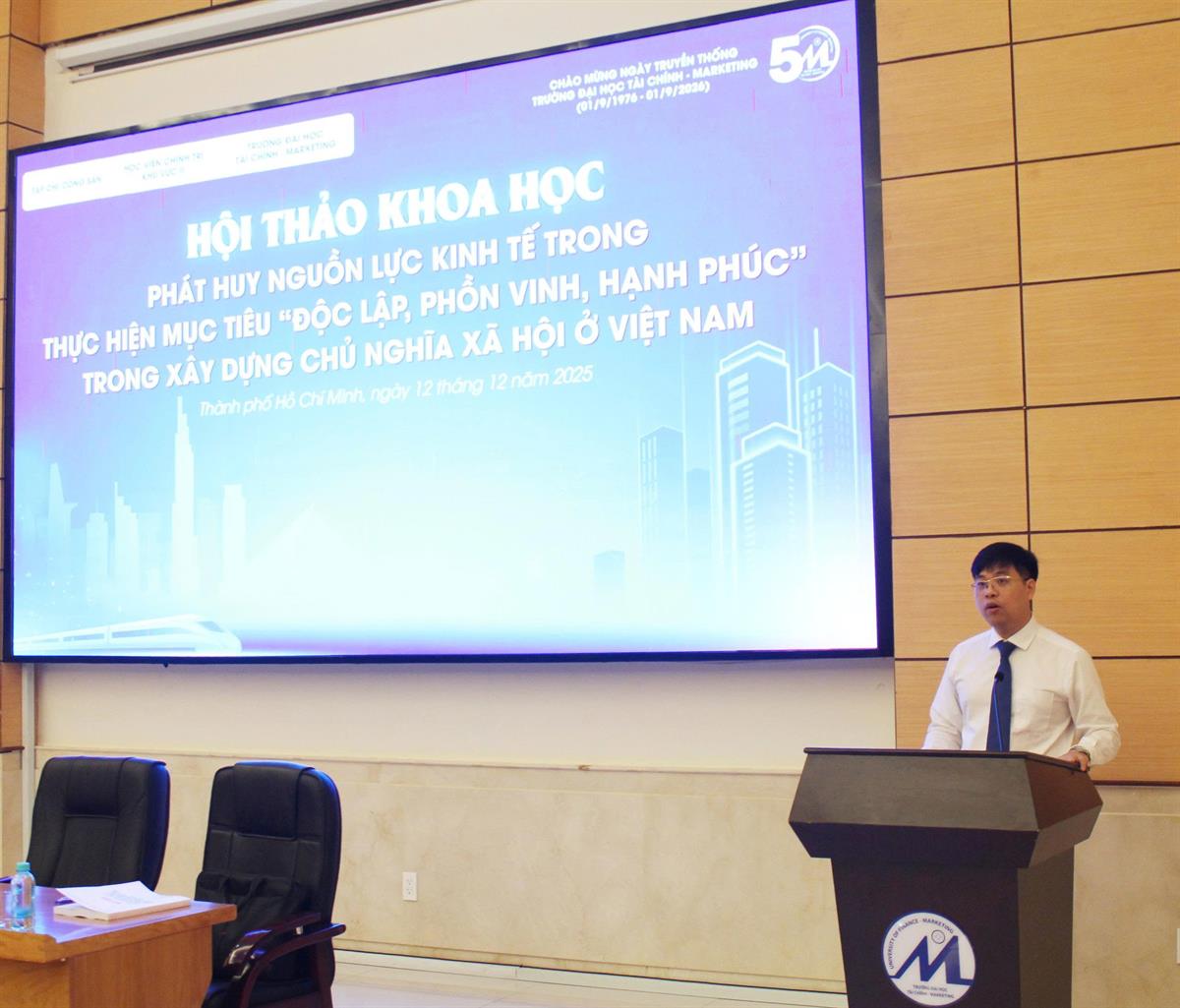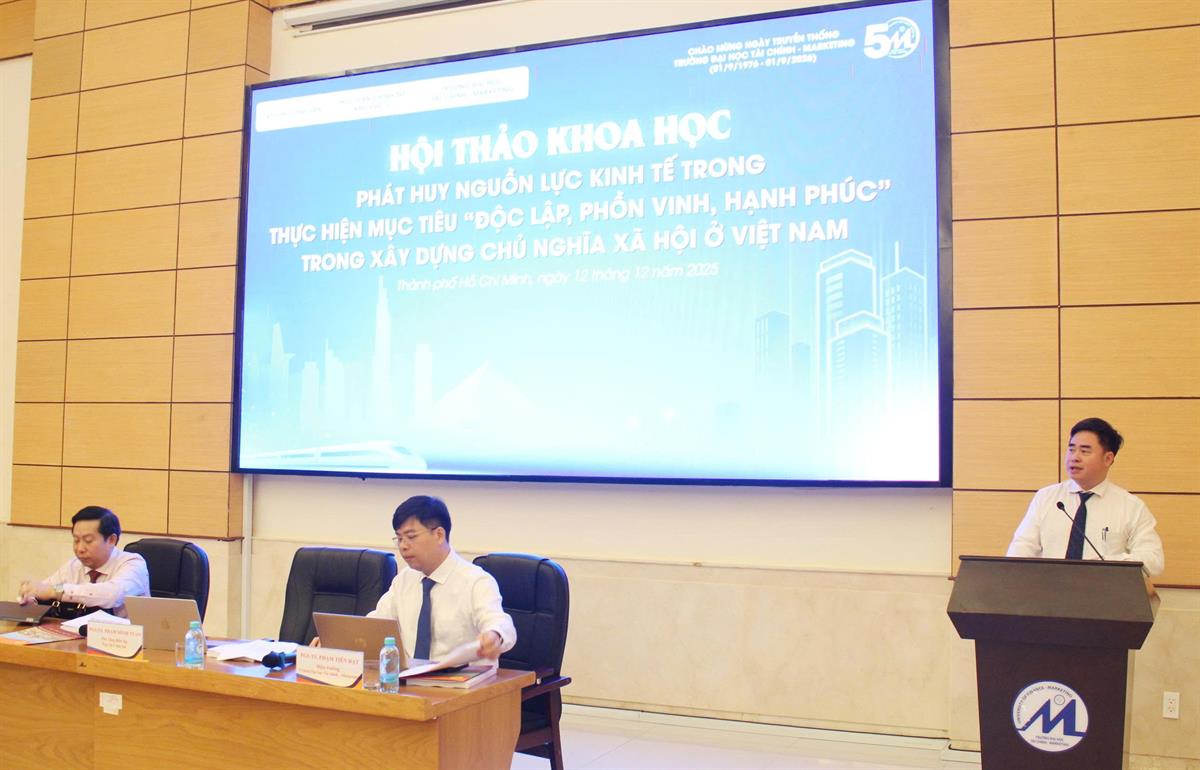 Phát biểu Đề dẫn Hội thảo, PGS, TS. Nguyễn Tấn Vinh khẳng định, chủ đề của Hội thảo là vấn đề có ý nghĩa lý luận và thực tiễn quan trọng trong bối cảnh cả hệ thống chính trị đang triển khai mục tiêu phát triển đến năm 2030, tầm nhìn năm 2045. Giai đoạn phát triển mới với hội nhập sâu rộng, chuyển đổi số, chuyển đổi xanh và biến động toàn cầu đòi hỏi Việt Nam huy động và sử dụng hiệu quả hơn các nguồn lực kinh tế. Sau gần 40 năm đổi mới, các nguồn lực này đã đóng góp quan trọng giúp Việt Nam duy trì tăng trưởng, vươn lên nhóm quốc gia thu nhập trung bình; mục tiêu đến năm 2025 hướng tới quy mô kinh tế 500 tỷ USD và GDP bình quân đầu người trên 5.000 USD. Đầu tư công tiếp tục đóng vai trò nền tảng hạ tầng; khu vực tư nhân khẳng định vai trò động lực; hội nhập quốc tế mở rộng nguồn vốn, công nghệ và thị trường. Tuy nhiên, hiệu quả sử dụng nguồn lực còn chưa đồng đều; đầu tư công ở một số nơi còn lãng phí, chậm tiến độ; thể chế kinh tế thị trường chưa đồng bộ; liên kết vùng thiếu cơ chế rõ ràng; doanh nghiệp tư nhân phần lớn quy mô nhỏ, năng lực công nghệ hạn chế. Những thách thức này đòi hỏi các phân tích khoa học và giải pháp khả thi để hoàn thiện chính sách, nâng cao hiệu quả huy động và sử dụng nguồn lực phục vụ mục tiêu “độc lập, phồn vinh, hạnh phúc”.
