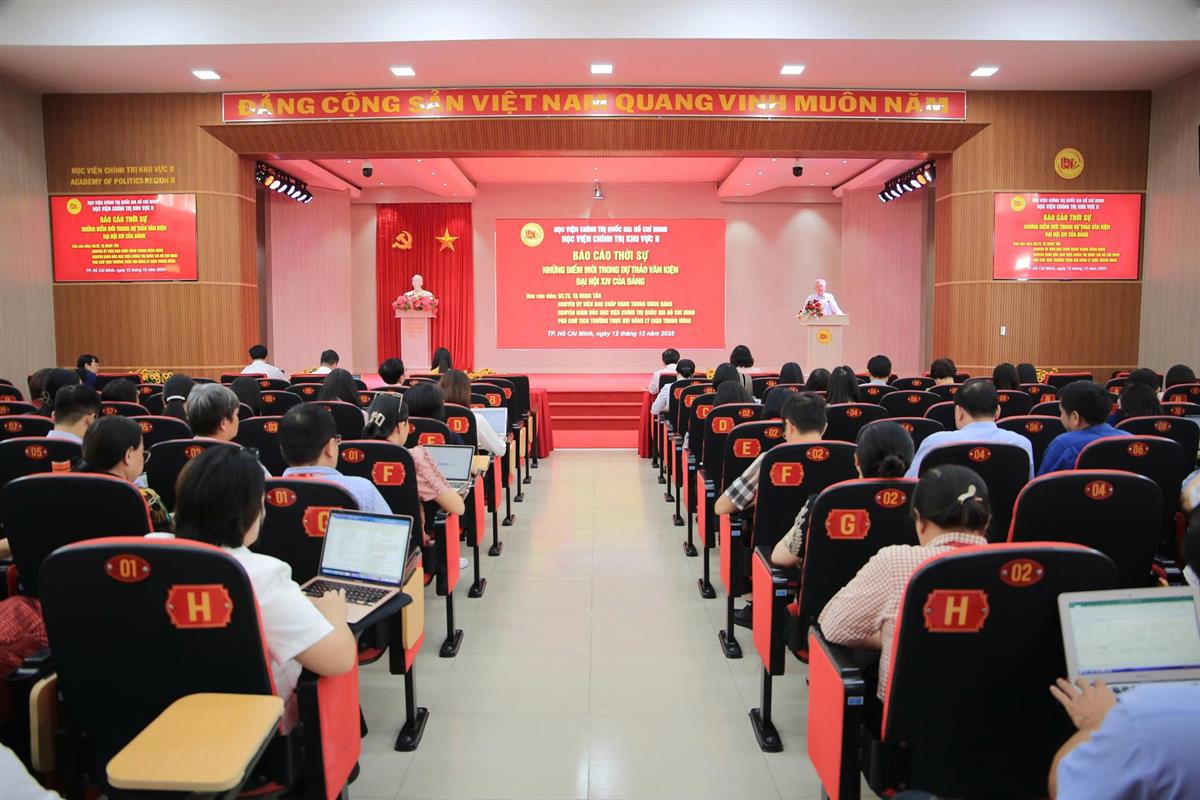 Tham dự Báo cáo thời sự có sự hiện diện của PGS, TS. Nguyễn Tấn Vinh - Ủy viên Ban Chấp hành Đảng bộ Học viện Chính trị quốc gia Hồ Chí Minh, Bí thư Đảng ủy, Giám đốc Học viện Chính trị khu vực II; PGS, TS. Nguyễn Thị Tuyết Mai - Phó Bí thư Đảng ủy, Phó Giám đốc Học viện Chính trị khu vực II; TS. Lê Thị Anh Đào - Ủy viên Ban Thường vụ Đảng ủy, Phó Giám đốc Học viện; các đồng chí trong Ban Chấp hành Đảng bộ; Lãnh đạo các đơn vị, cùng toàn thể viên chức, người lao động của Học viện.