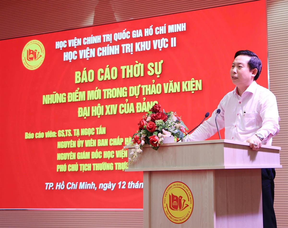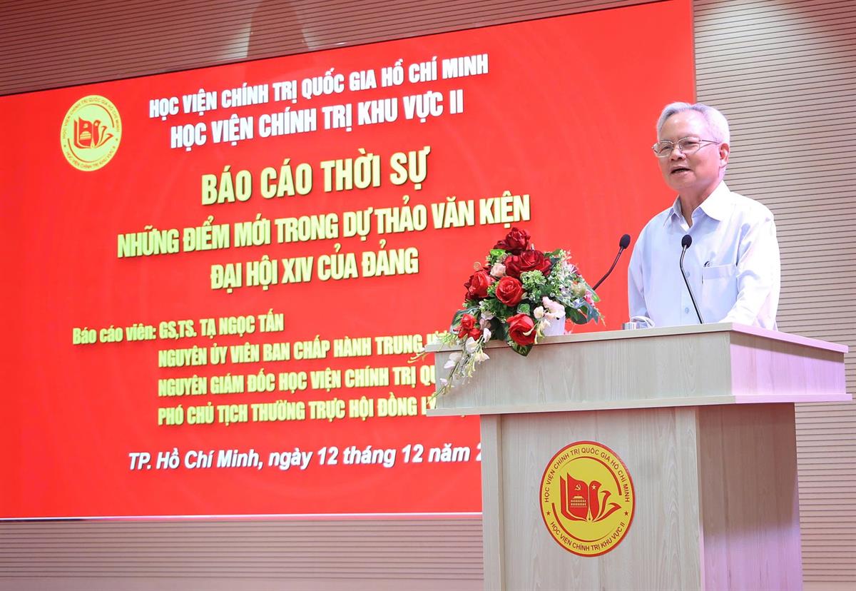 Trong thời gian diễn ra Báo cáo thời sự, GS, TS. Tạ Ngọc Tấn tập trung trình bày những điểm mới trong Dự thảo Văn kiện Đại hội XIV của Đảng, trong đó nhấn mạnh một số nội dung: