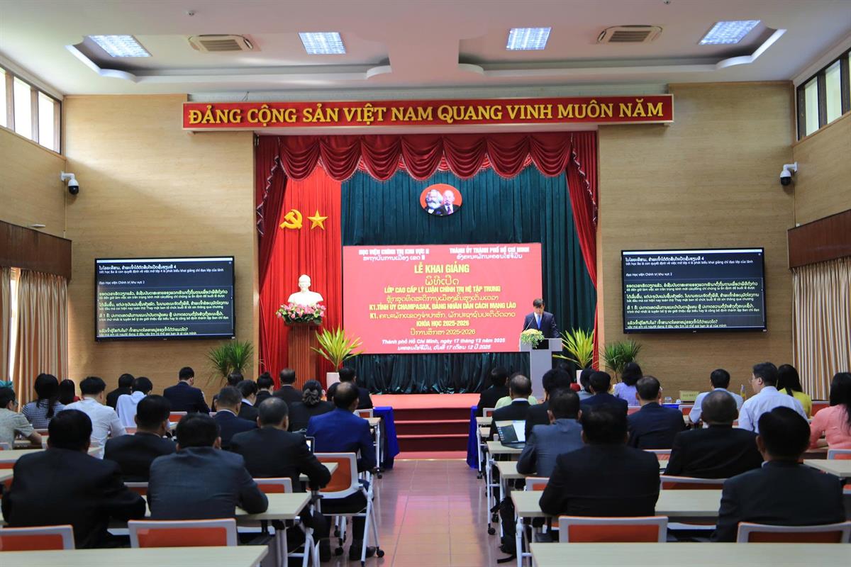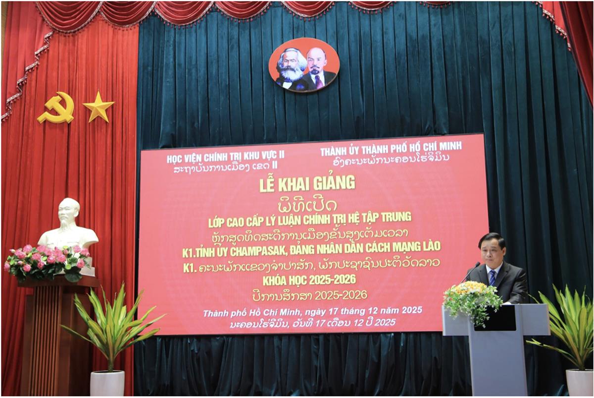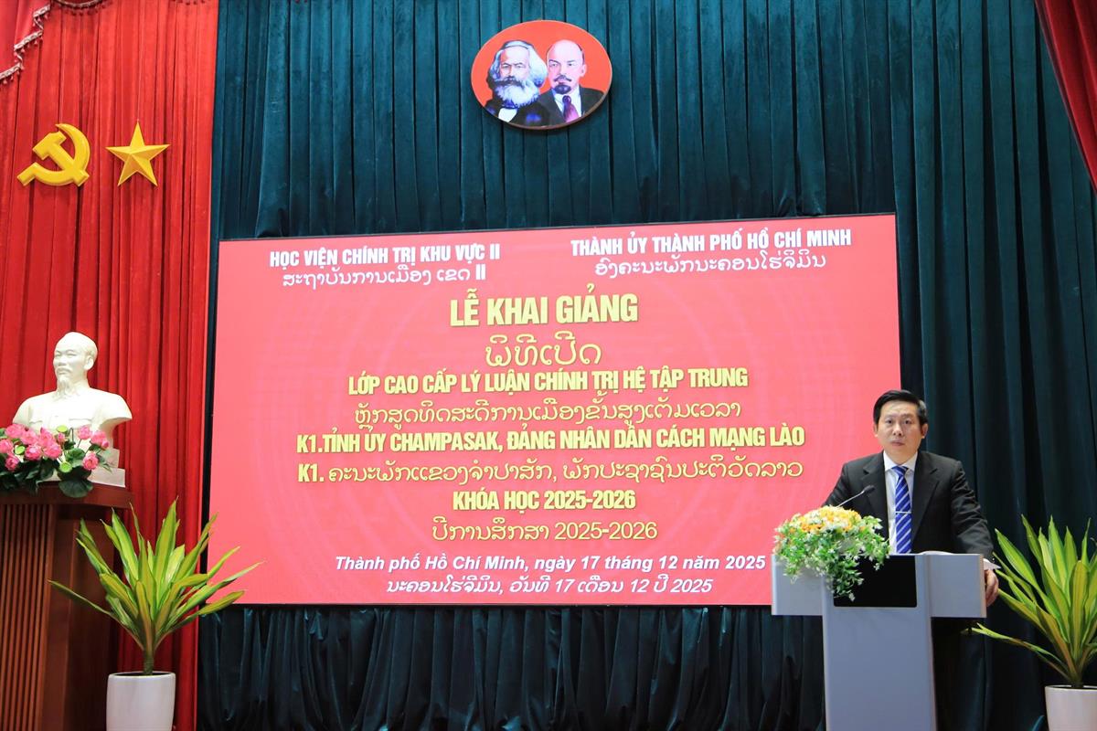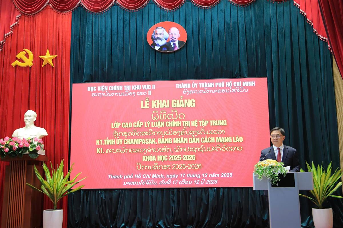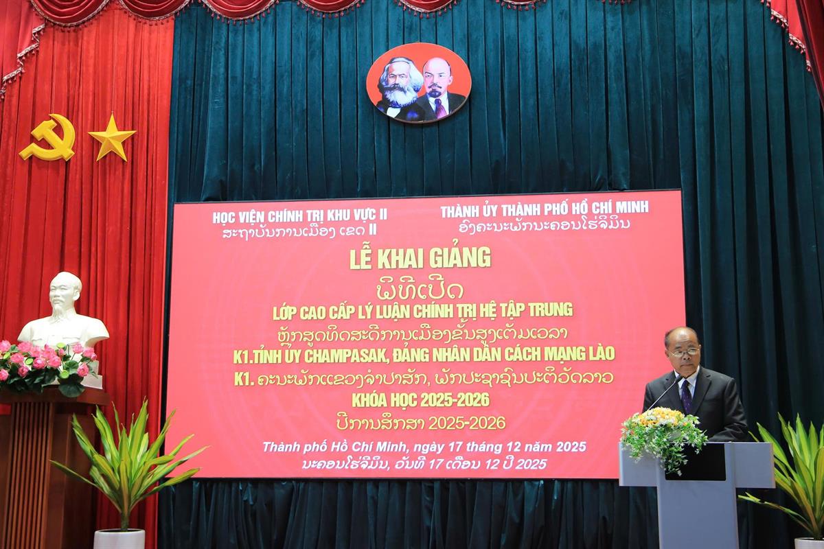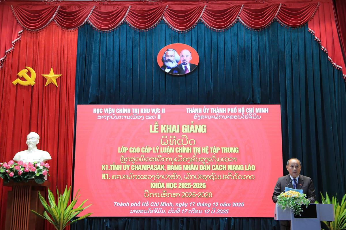 Sáng ngày 17/12/2025, Học viện Chính trị khu vực II phối hợp với Thành ủy, Ủy ban nhân dân Thành phố Hồ Chí Minh, Tổng Lãnh sự quán nước Cộng hòa Dân chủ Nhân dân Lào tại Thành phố Hồ Chí Minh và các đơn vị liên quan long trọng tổ chức Lễ khai giảng lớp Cao cấp lý luận chính trị hệ tập trung K1. Tỉnh ủy Champasak, Đảng Nhân dân Cách mạng Lào, khóa học 2025 - 2026.