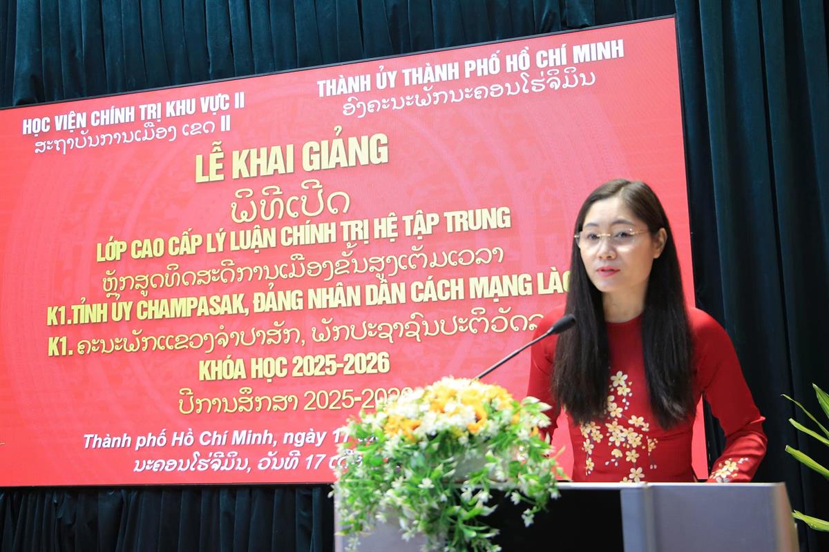 Phát biểu tại Lễ khai giảng, đồng chí Nguyễn Mạnh Cường khẳng định, Thành phố Hồ Chí Minh luôn coi trọng và ủng hộ mạnh mẽ các hoạt động hợp tác đào tạo, bồi dưỡng cán bộ giữa Việt Nam và Lào; đồng thời đánh giá cao vai trò nòng cốt của Học viện Chính trị khu vực II trong việc tổ chức, triển khai hiệu quả các chương trình đào tạo lý luận chính trị dành cho đội ngũ cán bộ lãnh đạo, quản lý của nước Cộng hòa Dân chủ Nhân dân Lào. Nhân dịp kỷ niệm 50 năm Quốc khánh nước Cộng hòa Dân chủ Nhân dân Lào (02/12/1975 - 02/12/2025) và 105 năm Ngày sinh Chủ tịch Cay-xỏn Phôm-vi-hản (13/12/1920 - 13/12/2025), đồng chí gửi lời chúc mừng tới toàn thể học viên; đồng thời chúc mừng các đồng chí đã được Tỉnh ủy Champasak tin tưởng, lựa chọn cử tham dự lớp đào tạo Cao cấp lý luận chính trị đầu tiên do Ủy ban nhân dân Thành phố Hồ Chí Minh phối hợp với Học viện Chính trị khu vực II tổ chức.
