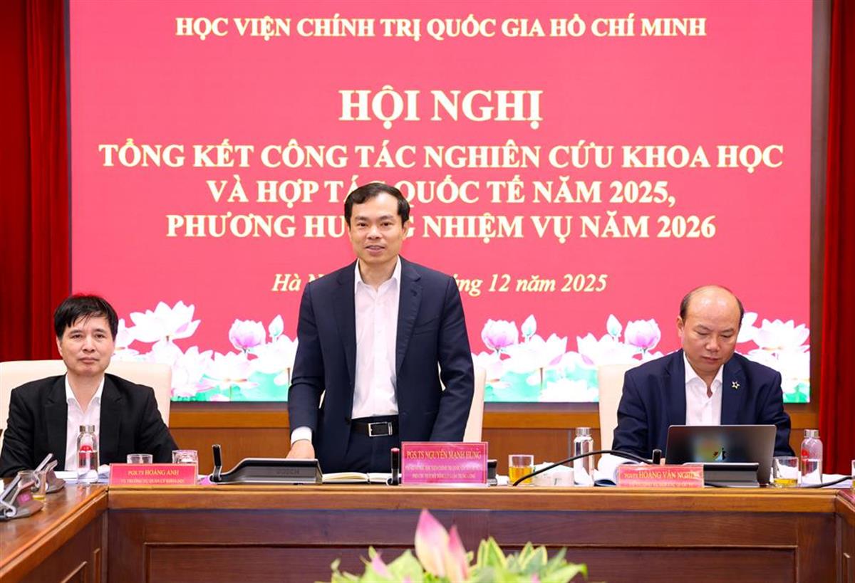 Phát biểu tại hội nghị, PGS,TS Nguyễn Mạnh Hùng, Phó Giám đốc Học viện, Phó Chủ tịch Hội đồng Lý luận Trung ương ghi nhận và chúc mừng những kết quả đạt được trong lĩnh vực quản lý khoa học và hợp tác quốc tế trong năm 2025. Nhất trí với phương hướng triển khai nhiệm vụ trong năm 2026, PGS,TS Nguyễn Mạnh Hùng đề nghị tập thể lãnh đạo, cán bộ, công chức viên chức Vụ Quản lý khoa học, Vụ Hợp tác quốc tế cần đổi mới tư duy, nhận thức, đẩy mạnh phân cấp phân quyền gắn với kiểm tra, giám sát và quy định trách nhiệm trong triển khai nhiệm vụ.