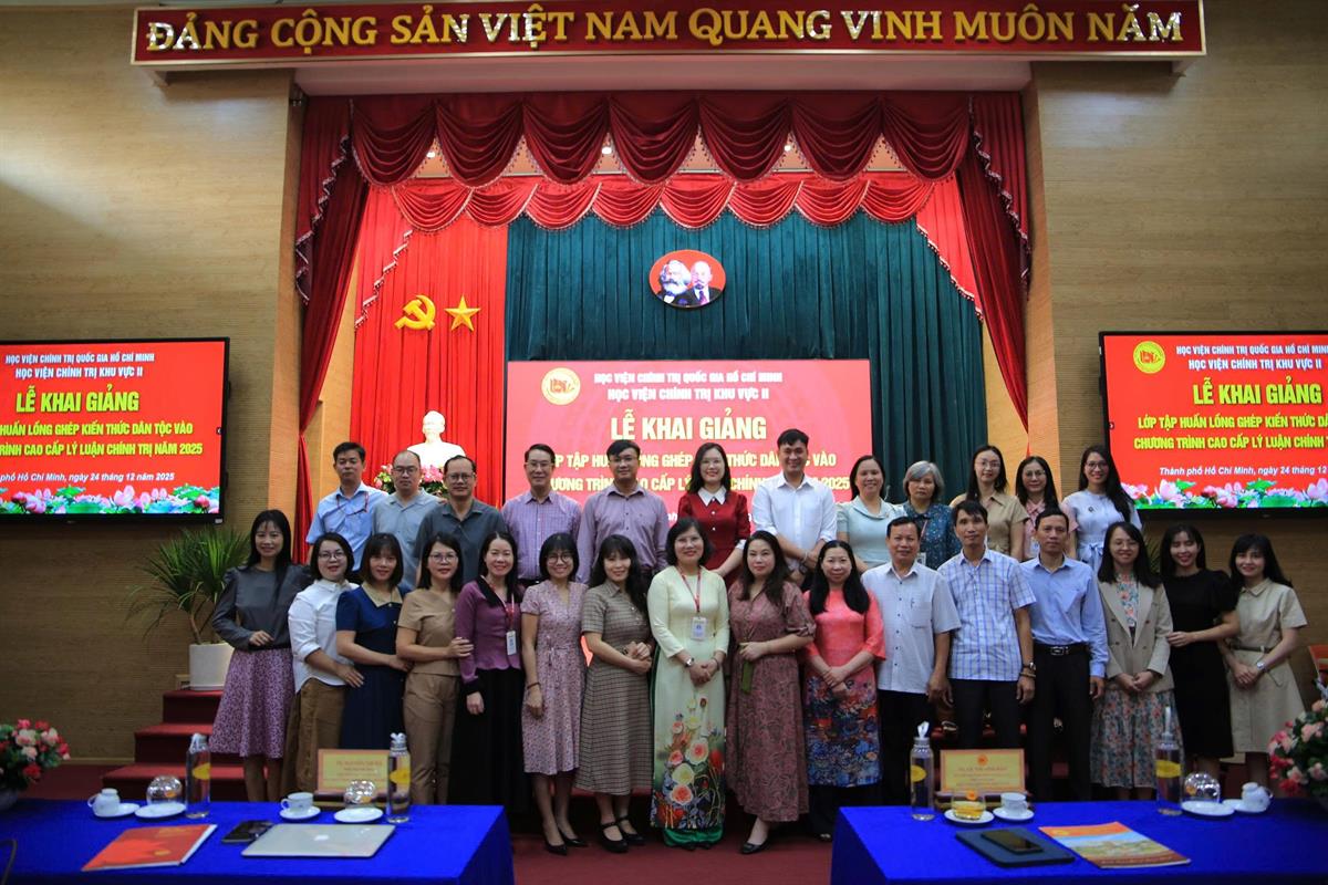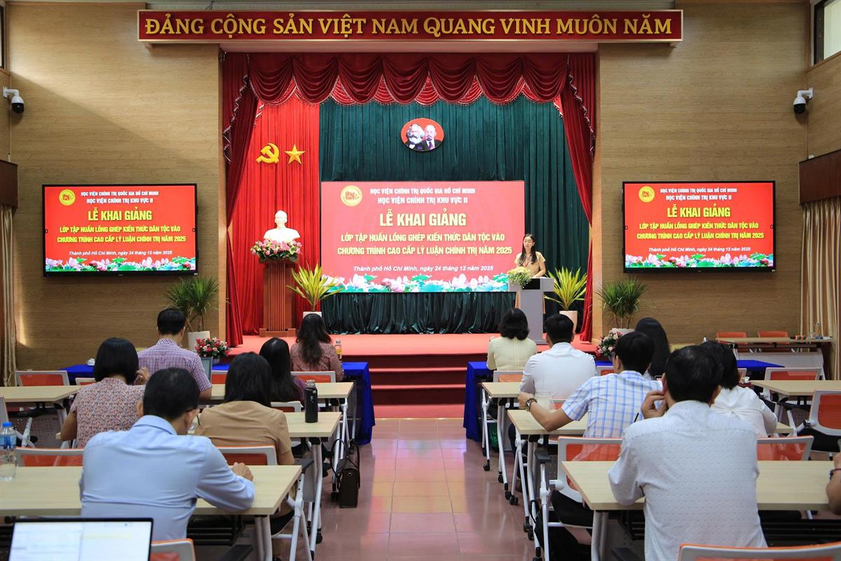 Sáng ngày 24/12/2025, Học viện Chính trị khu vực II tổ chức Lễ khai giảng lớp tập huấn “Lồng ghép kiến thức dân tộc vào chương trình Cao cấp lý luận chính trị năm 2025” (lớp thứ hai) theo Kế hoạch số 293-KH/HVCTKVII ngày 11/12/2025 của Giám đốc Học viện.