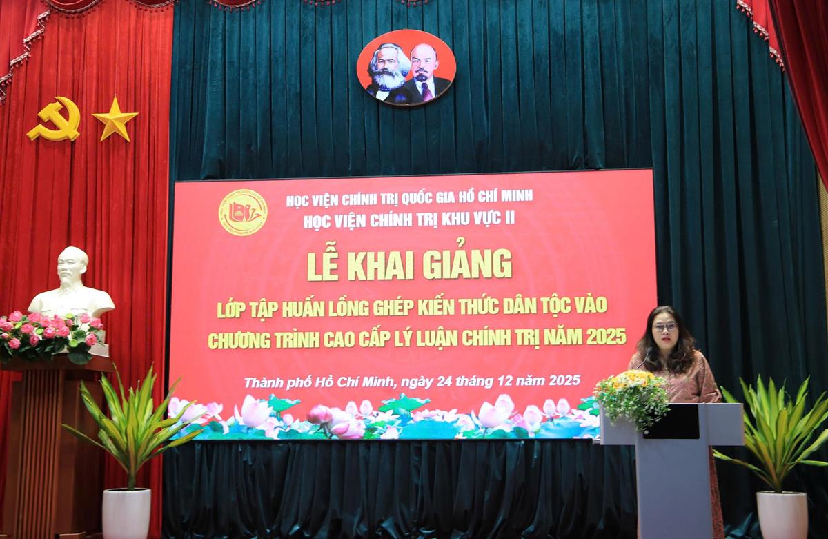 Đại diện Ban Giám đốc Học viện Chính trị khu vực II phát biểu tại Lễ khai giảng, TS. Lê Thị Anh Đào nhấn mạnh, vấn đề dân tộc và đại đoàn kết toàn dân tộc là sợi chỉ đỏ xuyên suốt trong tư tưởng chỉ đạo của Đảng, có ý nghĩa quyết định đối với sự ổn định và phát triển bền vững của đất nước. Trước yêu cầu thực tiễn từ việc triển khai Chương trình mục tiêu quốc gia phát triển kinh tế - xã hội vùng đồng bào dân tộc thiểu số và miền núi, việc nâng cao chất lượng đào tạo lý luận chính trị, đặc biệt là vai trò tiên phong của đội ngũ giảng viên trong cập nhật, chuẩn hóa và lồng ghép kiến thức dân tộc vào chương trình đào tạo, là nhiệm vụ hết sức cấp thiết. TS. Lê Thị Anh Đào khẳng định, việc lồng ghép kiến thức dân tộc trong chương trình Cao cấp lý luận chính trị không chỉ là bổ sung nội dung mà còn đòi hỏi đổi mới phương pháp và tư duy giảng dạy, nhất là đối với các khối kiến thức về xây dựng Đảng, Nhà nước, quốc phòng, an ninh và đối ngoại, nhằm nâng cao khả năng vận dụng lý luận vào thực tiễn.