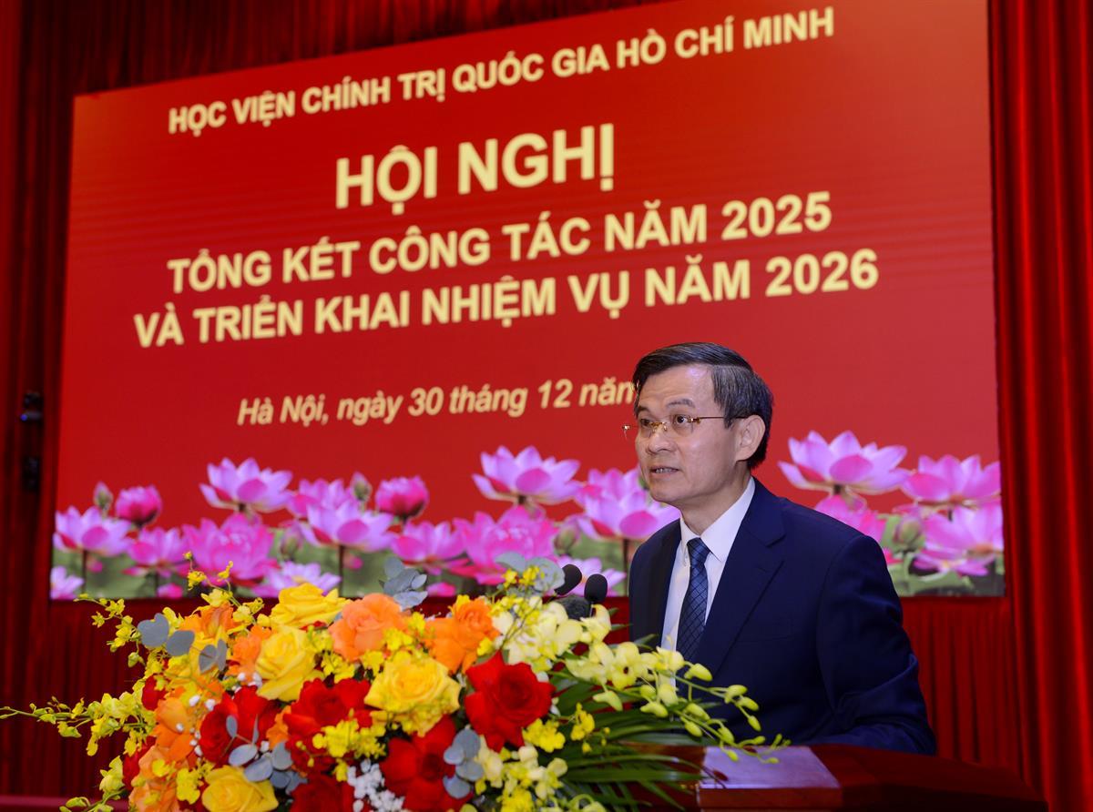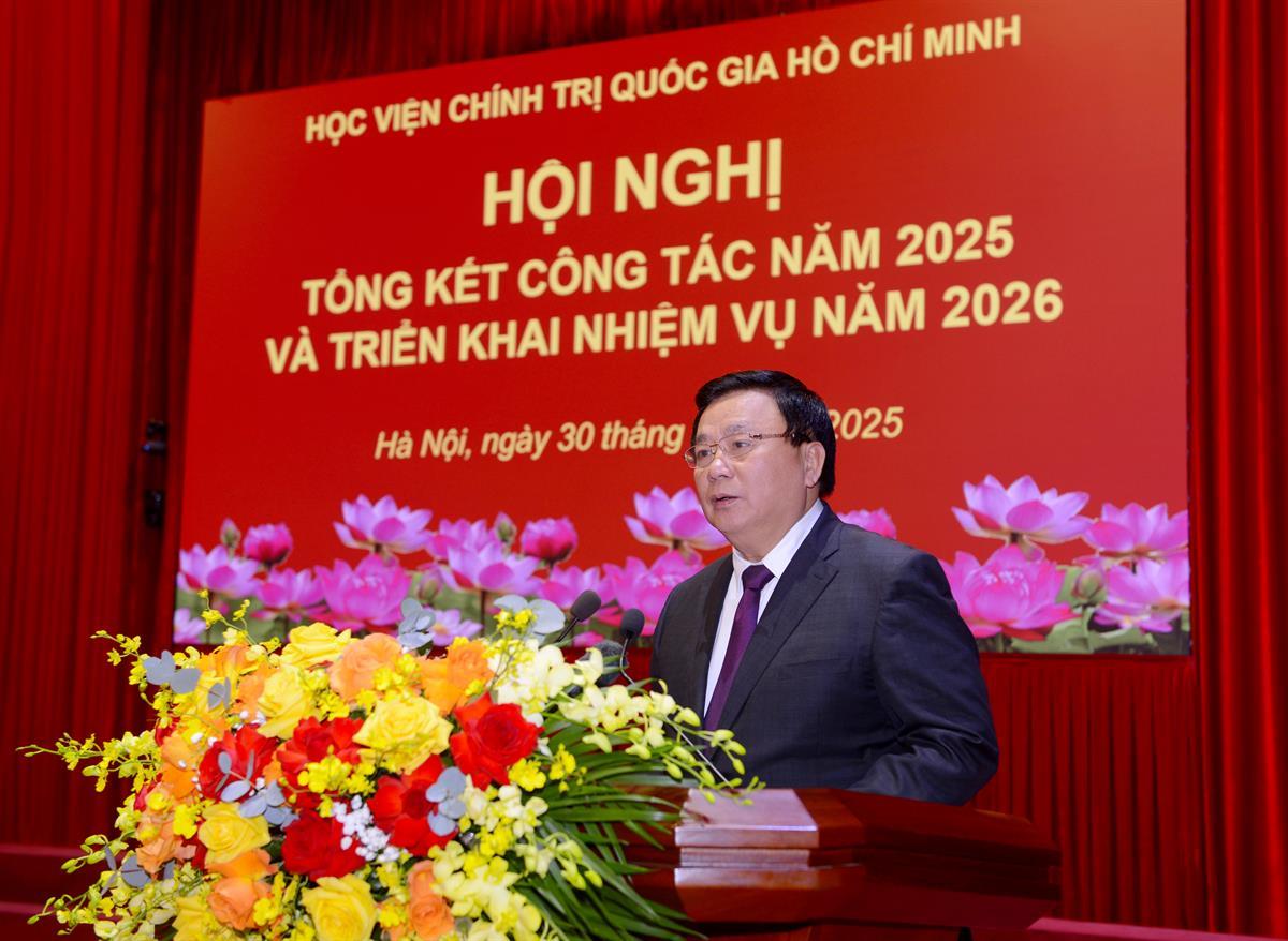 Trình bày tóm tắt Báo cáo tổng kết công tác năm 2025, phương hướng, nhiệm vụ năm 2026 tại Hội nghị, PGS,TS Đoàn Minh Huấn, Uỷ viên Ban Chấp hành Trung ương Đảng, Phó Giám đốc thường trực Học viện Chính trị quốc gia Hồ Chí Minh cho biết, năm 2025 là một năm rất đặc biệt trong bối cảnh môi trường chiến lược có nhiều thay đổi, là năm tổ chức đại hội đảng bộ các cấp và chuẩn bị Đại hội Đảng toàn quốc lần thứ XIV của Đảng, là năm Đảng ta đề ra và triển khai những đột phá chiến lược mang tính cách mạng, nhất là sắp xếp đơn vị hành chính, tinh gọn tổ chức bộ máy, định hình cấu trúc mới của hệ thống chính trị và mô hình tổ chức chính quyền địa phương hai cấp. Sự thay đổi môi trường chiến lược vừa đặt ra yêu cầu cao hơn đối với công tác nghiên cứu lý luận và đào tạo cán bộ, vừa tạo động lực thúc đẩy Học viện cơ cấu lại tổ chức và đổi mới các mặt hoạt động, qua đó nâng cao vị thế, làm tròn vai trò, sứ mệnh của mình trong kỷ nguyên phát triển mới.