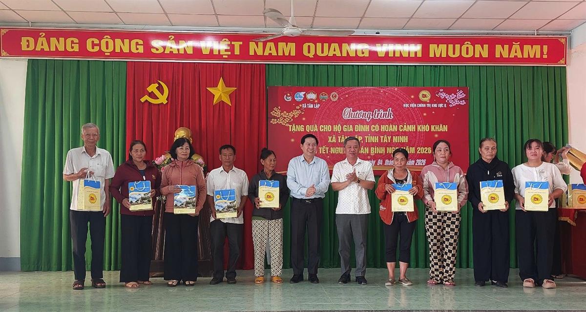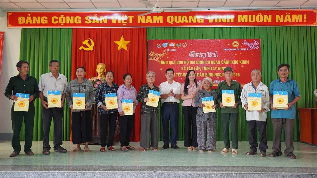 Cùng ngày, Đoàn công tác đã phối hợp với chính quyền địa phương tổ chức Chương trình trao quà cho các hộ gia đình có hoàn cảnh khó khăn tại xã Tân Lập và xã Tầm Vu. Cụ thể, Đoàn trao tặng 50 phần quà cho người dân xã Tân Lập và 40 phần quà cho người dân xã Tầm Vu. Mỗi phần quà trị giá 1.000.000 đồng, với tổng kinh phí thực hiện Chương trình là 90 triệu đồng (từ nguồn ủng hộ trong Chương trình Xuân yêu thương năm 2026). Những phần quà thể hiện tinh thần sẻ chia, trách nhiệm xã hội và tình cảm của đội ngũ cán bộ, viên chức, học viên Học viện đối với người dân vùng còn nhiều khó khăn.