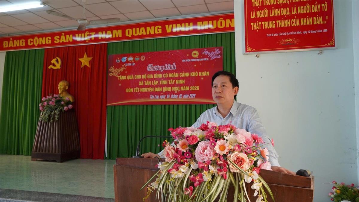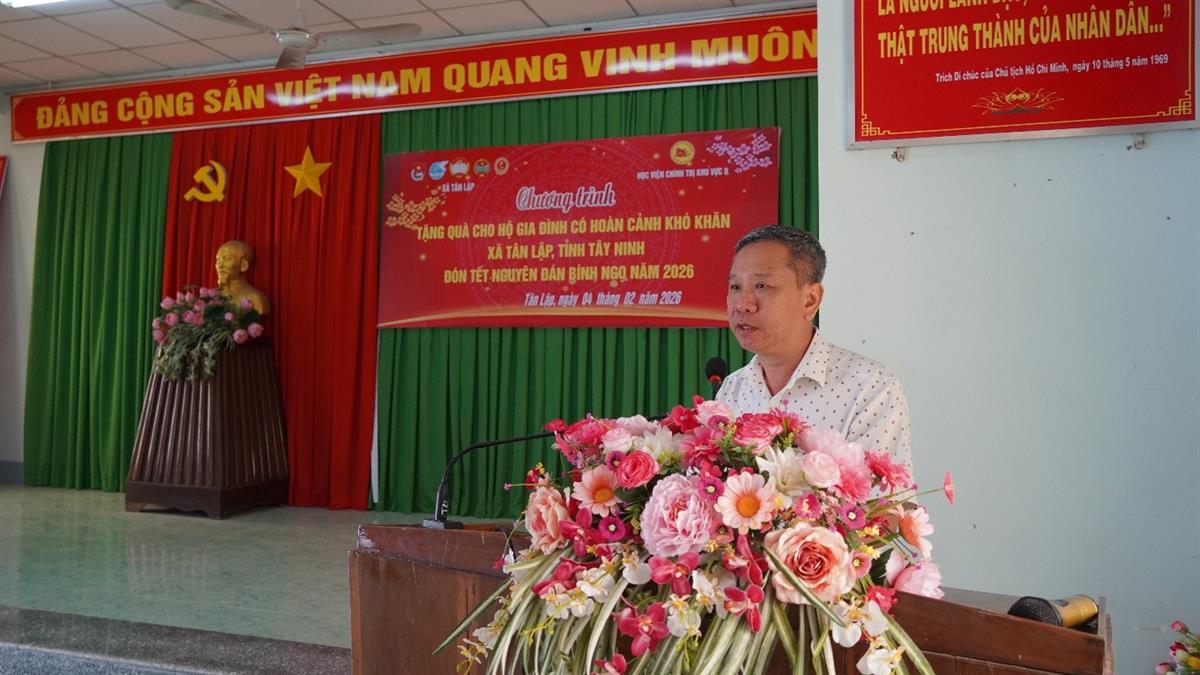 Phát biểu tại Chương trình, PGS, TS. Nguyễn Tấn Vinh chia sẻ, Chương trình thể hiện rõ quan điểm nhất quán của Học viện là thực hiện nhiệm vụ đào tạo, bồi dưỡng lý luận chính trị phải gắn kết với thực tiễn đời sống xã hội, gắn trách nhiệm của đội ngũ cán bộ, giảng viên và học viên với cộng đồng. Những phần quà tuy giá trị vật chất không lớn nhưng chứa đựng tình cảm, sự sẻ chia và trách nhiệm xã hội của tập thể viên chức, người lao động và học viên đối với người dân địa phương. PGS, TS. Nguyễn Tấn Vinh khẳng định, thông qua những hoạt động thiết thực mang ý nghĩa nhân văn sâu sắc, mối quan hệ giữa Học viện Chính trị khu vực II với cấp ủy, chính quyền địa phương và nhân dân tỉnh Tây Ninh sẽ tiếp tục được củng cố, gắn kết và phát triển bền vững; đồng thời góp phần bồi đắp thêm bản lĩnh chính trị, ý thức phụng sự nhân dân cho đội ngũ viên chức, người lao động và học viên của Học viện Chính trị khu vực II.