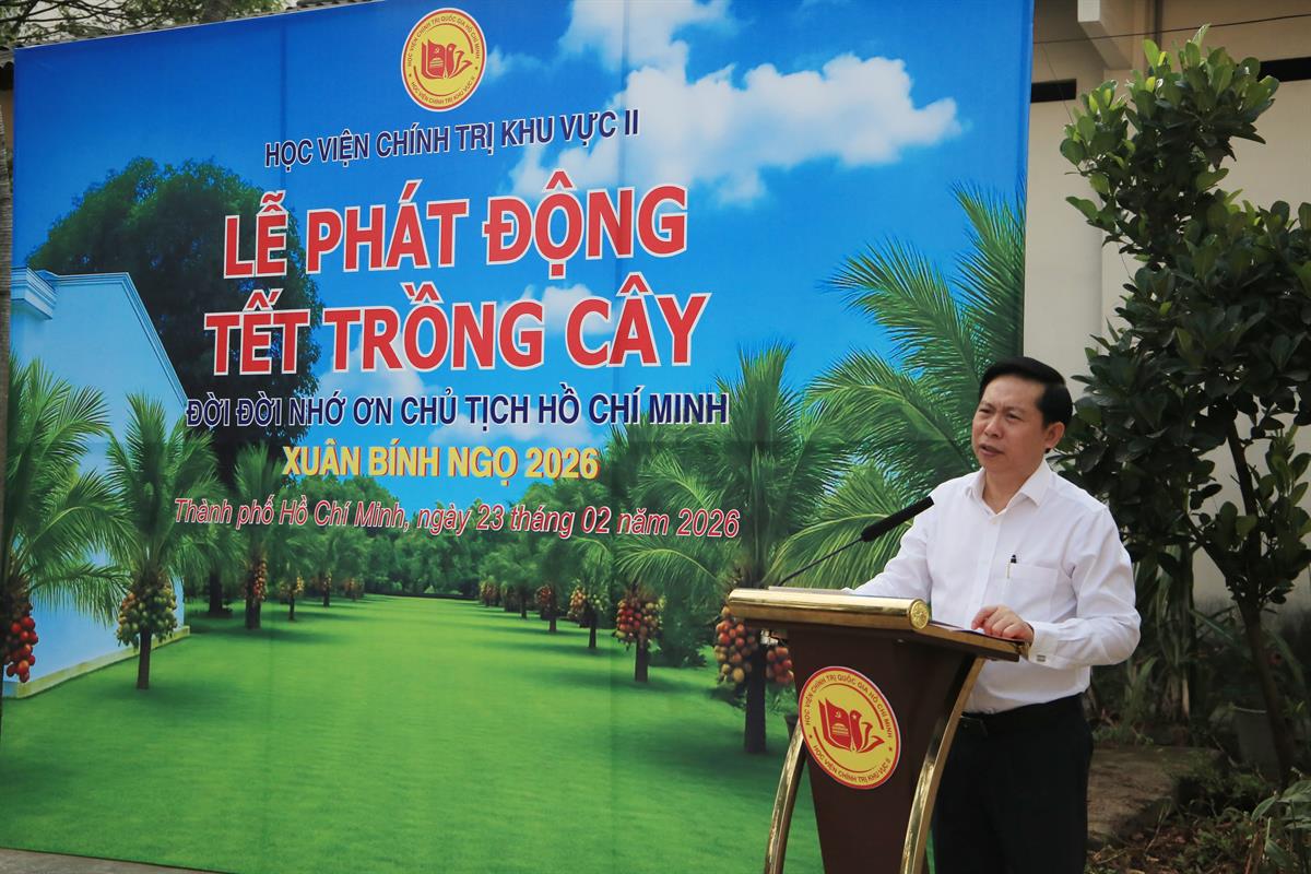 PGS, TS. Nguyễn Tấn Vinh đề nghị toàn thể cán bộ, viên chức, người lao động tiếp tục lan tỏa tinh thần Tết trồng cây gắn với nhiệm vụ xây dựng và phát triển nguồn nhân lực phục vụ sự nghiệp phát triển đất nước; xây dựng Học viện Chính trị khu vực II ngày càng văn minh, hiện đại, xứng đáng với vị trí, vai trò và tiếp nối truyền thống vẻ vang của Trường Đảng miền Nam.