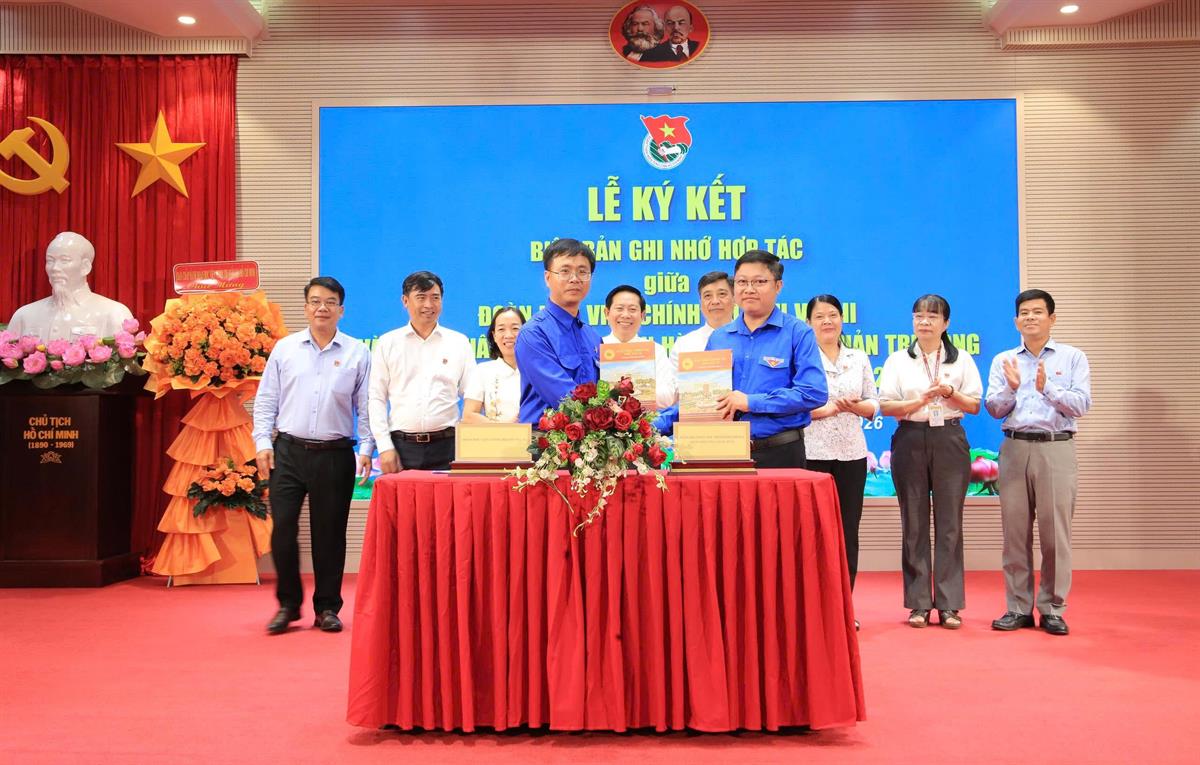 TS. Nguyễn Hữu Hoàng và ThS. Lê Đức Hiền ký kết Biên bản ghi nhớ hợp tác giữa Đoàn Thanh niên Học viện Chính trị khu vực II và Đoàn Phân hiệu Học viện Hành chính và Quản trị công tại Thành phố Hồ Chí Minh (giai đoạn 2026 - 2028)