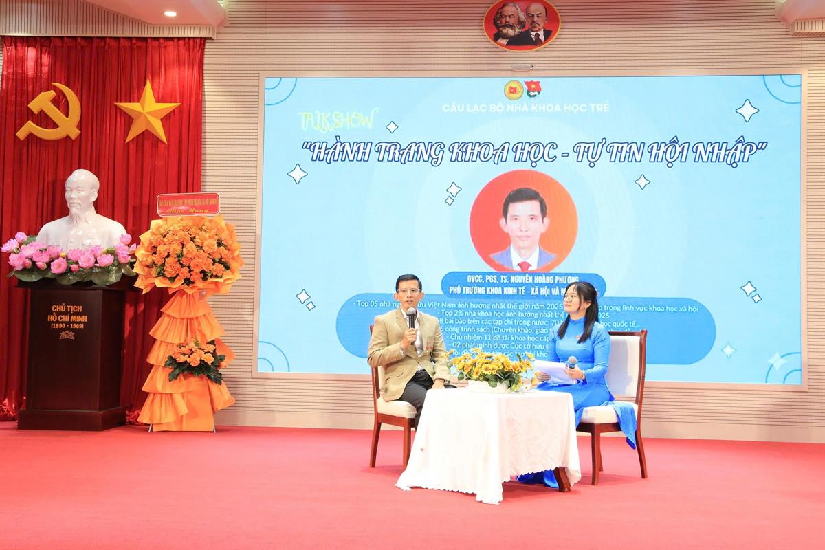 Trong khuôn khổ Lễ kỷ niệm, talkshow với chủ đề “Hành trang khoa học - Tự tin hội nhập”, với sự tham gia chia sẻ của PGS,TS. Nguyễn Hoàng Phương - Phó Trưởng khoa Kinh tế, xã hội và môi trường, đã thu hút sự quan tâm của đông đảo đoàn viên, giảng viên trẻ. Từ câu hỏi về hành trình nghiên cứu, PGS,TS. Nguyễn Hoàng Phương khẳng định, con đường khoa học là quá trình tích lũy bền bỉ, đòi hỏi sự kiên trì, tinh thần tự học và khả năng thích ứng với yêu cầu ngày càng cao của môi trường học thuật. Đồng thời, PGS,TS. Nguyễn Hoàng Phương nhấn mạnh những hành trang cốt lõi đối với người làm nghiên cứu, như tư duy khoa học, phương pháp nghiên cứu bài bản, định hướng rõ ràng và kỷ luật học thuật; chia sẻ kinh nghiệm về kỹ năng viết và công bố bài báo, lựa chọn tạp chí phù hợp, nhận diện tạp chí kém chất lượng, cũng như xây dựng mạng lưới học thuật và nhóm nghiên cứu. Các nội dung trao đổi mang tính định hướng và thực tiễn, góp phần trang bị nền tảng cần thiết để đoàn viên, giảng viên trẻ tự tin phát triển con đường nghiên cứu khoa học trong bối cảnh hội nhập.