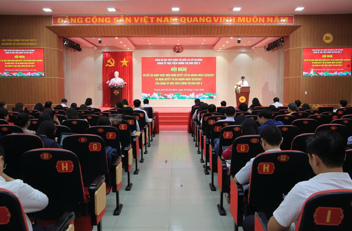 Thực hiện Kế hoạch số 19-KH/ĐU ngày 17/3/2026, chiều ngày 26/3/2026, Đảng ủy Học viện Chính trị khu vực II tổ chức Hội nghị sơ kết 05 năm thực hiện Nghị quyết số 04-NQ/ĐU ngày 02/8/2021 về nâng cao chất lượng công tác đào tạo, bồi dưỡng giai đoạn 2021 - 2025 (Nghị quyết số 04-NQ/ĐU ) và Nghị quyết số 05-NQ/ĐU ngày 02/8/2021 về nâng cao hiệu quả hoạt động nghiên cứu khoa học của Học viện Chính trị khu vực II giai đoạn 2021 - 2025 (Nghị quyết số 05-NQ/ĐU).