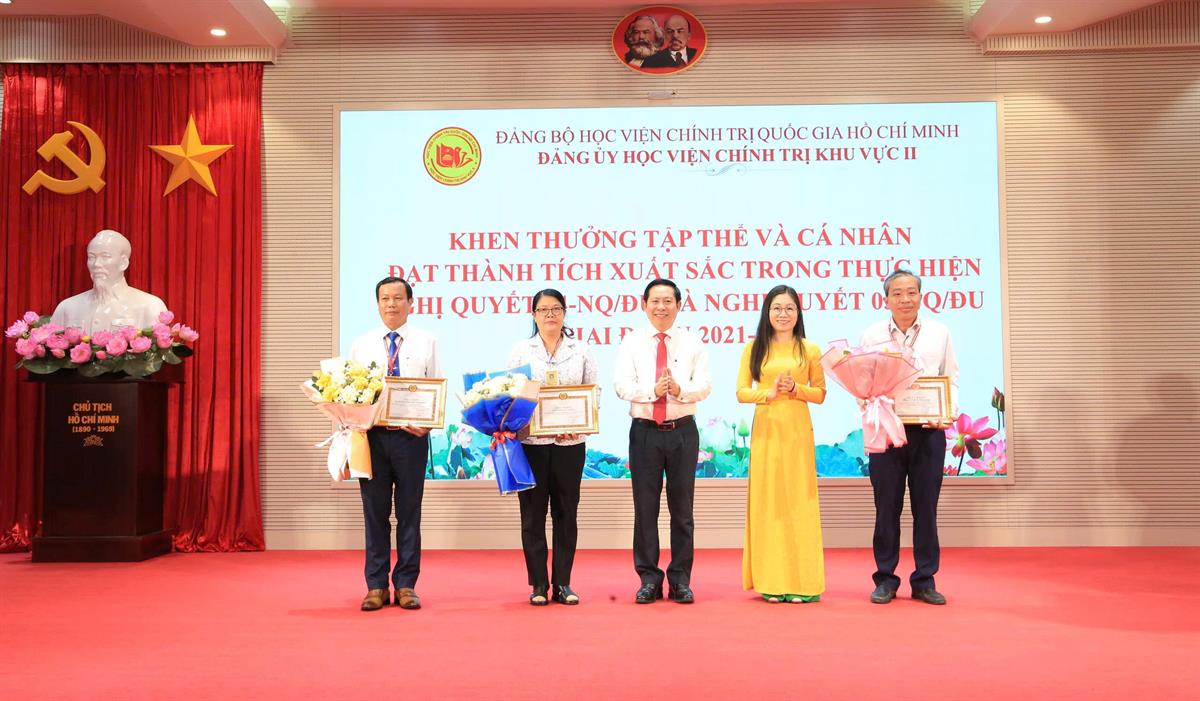 Sau phần tham luận đến từ 05 chi bộ (Chi bộ Ban Quản lý đào tạo, bồi dưỡng, Chi bộ Ban Quản lý khoa học và Hợp tác quốc tế, Chi bộ khoa Kinh tế - Xã hội và Môi trường, Chi bộ khoa Lãnh đạo học và Hành chính công, Chi bộ khoa Chủ nghĩa xã hội khoa học), Hội nghị tiến hành trao tặng các hình thức khen thưởng cho 02 tập thể (Khoa Chủ nghĩa xã hội khoa học, Khoa Lịch sử Đảng) và 01 cá nhân ( đ/c Trần Tư Hồng Quân – Chi bộ Ban Quản lý đào tạo, bồi dưỡng) đã đạt thành tích xuất sắc trong thực hiện Nghị quyết số 04-NQ/ĐU và Nghị quyết số 05-NQ/ĐU giai đoạn 2021 - 2015.
