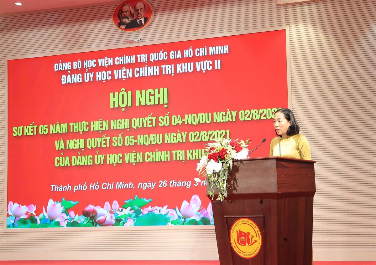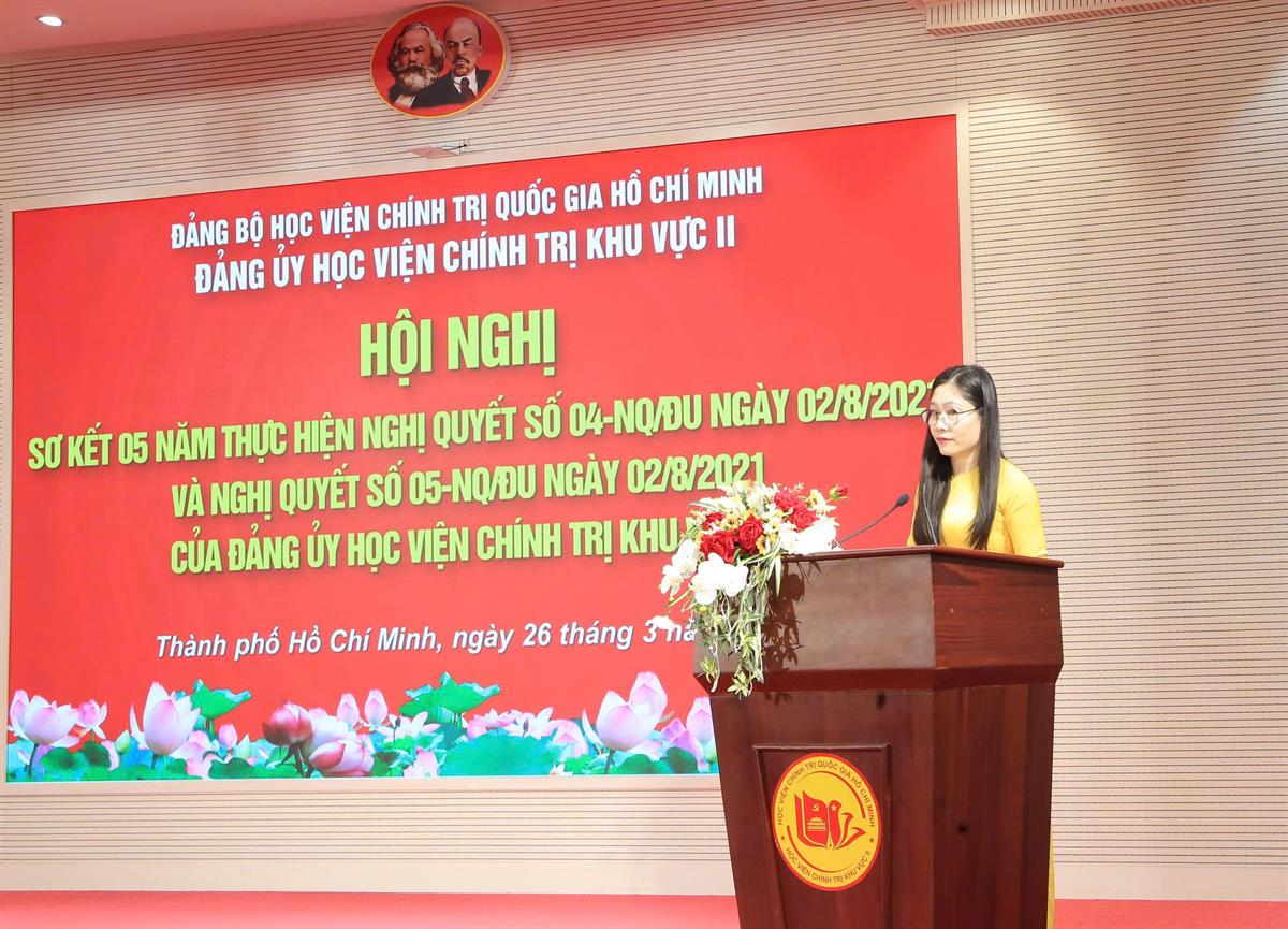 TS. Lê Thị Anh Đào - Ủy viên Ban Thường vụ Đảng ủy, Phó Giám đốc Học viện Chính trị khu vực II báo cáo việc thực hiện Nghị quyết số 05-NQ/ĐU