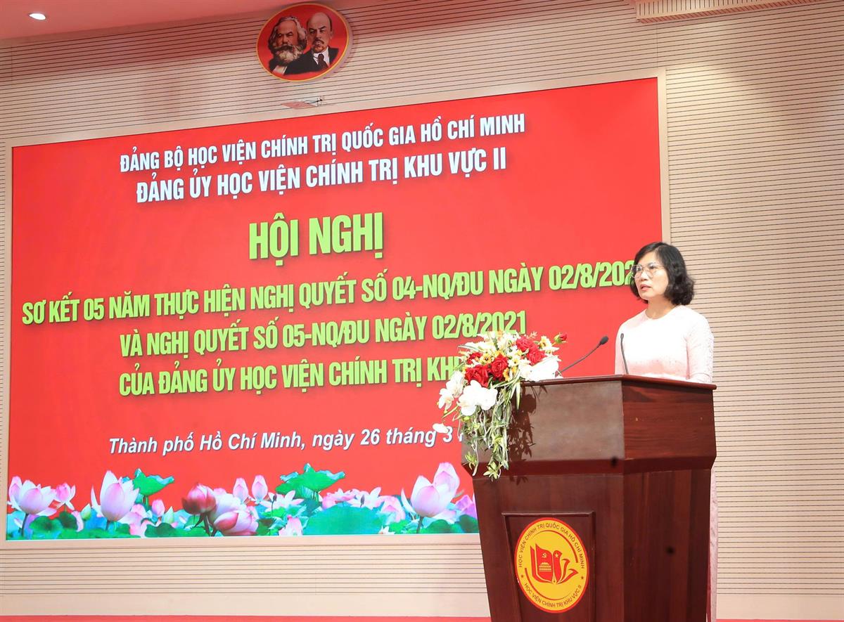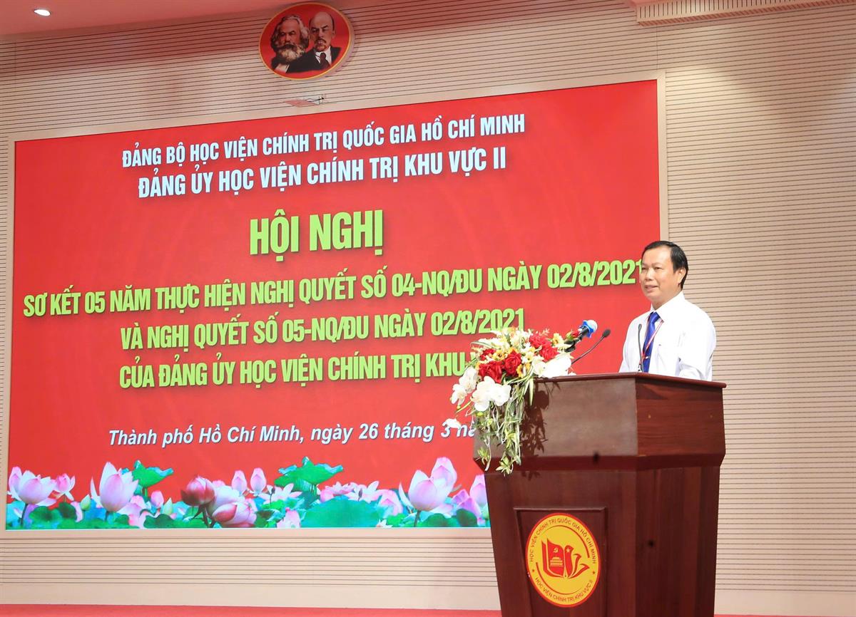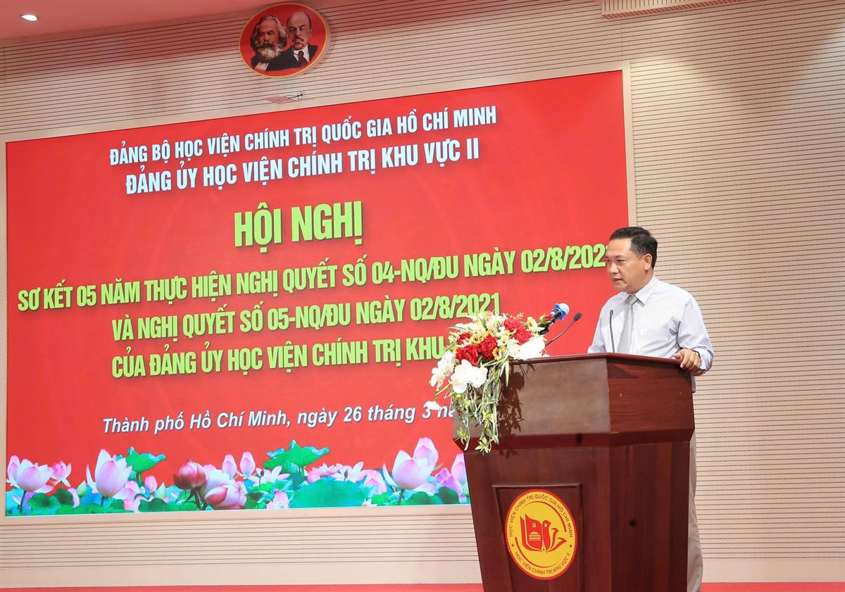 Theo PGS, TS. Nguyễn Tấn Vinh, Nghị quyết số 04-NQ/ĐU và Nghị quyết số 05-NQ/ĐU được ban hành ngày 02/8/2021 là sự cụ thể hóa kịp thời chủ trương của Đảng ủy Học viện Chính trị quốc gia Hồ Chí Minh, bám sát yêu cầu đổi mới căn bản, toàn diện công tác đào tạo, bồi dưỡng và nghiên cứu khoa học trong bối cảnh đất nước hội nhập quốc tế sâu rộng và chuyển đổi số mạnh mẽ. Sau 05 năm triển khai thực hiện, với sự lãnh đạo, chỉ đạo đồng bộ, quyết liệt, Học viện Chính trị khu vực II đã đạt được nhiều kết quả quan trọng, tạo chuyển biến tích cực cả về nhận thức và hành động. Bên cạnh những thành tựu đạt được, PGS, TS. Nguyễn Tấn Vinh cũng thẳng thắn chỉ ra một số hạn chế, nguyên nhân, bài học kinh nghiệm cần khắc phục trong thời gian tới; đồng thời đồng chí đề nghị Hội nghị tập trung thảo luận thẳng thắn, khách quan, đề xuất các giải pháp mang tính đột phá, khả thi, phù hợp với điều kiện thực tiễn của Học viện Chính trị khu vực II trong giai đoạn tới. Với ý nghĩa đó, PGS, TS. Nguyễn Tấn Vinh tin tưởng với truyền thống đoàn kết, trách nhiệm và phát triển, Đảng bộ và toàn thể viên chức, người lao động Học viện Chính trị khu vực II sẽ tiếp tục phát huy những kết quả đạt được, quyết tâm thực hiện thắng lợi các mục tiêu, nhiệm vụ đã đề ra, xây dựng Học viện ngày càng vững mạnh.