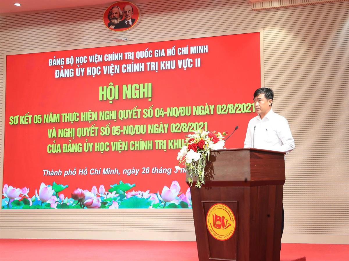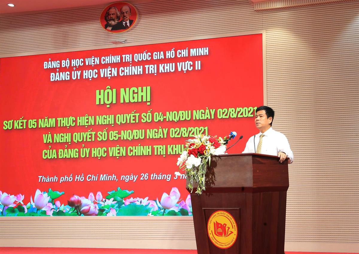 Phát biểu chỉ đạo Hội nghị, PGS, TS. Nguyễn Duy Bắc nhấn mạnh, việc sơ kết 05 năm thực hiện Nghị quyết số 04-NQ/ĐU và Nghị quyết số 05-NQ/ĐU có ý nghĩa quan trọng không chỉ đối với Học viện Chính trị khu vực II, mà còn đối với toàn hệ thống Học viện. PGS, TS. Nguyễn Duy Bắc ghi nhận và biểu dương, đánh giá cao những nỗ lực, quyết tâm chính trị cao của Đảng ủy, Ban Giám đốc và toàn thể viên chức, người lao động Học viện Chính trị khu vực II trong việc cụ thể hóa và tổ chức thực hiện hai nghị quyết một cách nghiêm túc, chất lượng, đạt được nhiều chuyển biến tích cực trong công tác đào tạo, bồi dưỡng và hoạt động nghiên cứu khoa học. Trên cơ sở đó, PGS, TS. Nguyễn Duy Bắc đề ra 03 định hướng lớn đối với Học viện Chính trị khu vực II: (1) Tiếp tục đánh giá đúng, thực chất quá trình triển khai thực hiện Nghị quyết số 04-NQ/ĐU và Nghị quyết số 05-NQ/ĐU, xác định rõ kết quả đã đạt được, thẳng thắn chỉ ra những hạn chế, nguyên nhân, bài học kinh nghiệm của hai nghị quyết này; (2) Bám sát chủ trương, đường lối về giáo dục, đào tạo, đột phá sáng tạo, khoa học, công nghệ, chuyển đổi số của Đảng, Nhà nước và của Học viện Chính trị quốc gia Hồ Chí Minh để vận dụng sáng tạo trong toàn bộ hoạt động của Học viện Chính trị khu vực II; (3) Xây dựng đội ngũ cán bộ có chất lượng về giáo dục đào tạo, nghiên cứu khoa học của Học viện Chính trị khu vực II đảm đương tốt các nhiệm vụ mới được Đảng, Nhà nước giao phó. Với tinh thần đó, PGS, TS. Nguyễn Duy Bắc tin tưởng rằng, Học viện Chính trị khu vực II sẽ tiếp tục phát huy vai trò xứng đáng, xứng tầm là một trong những trung tâm đào tạo, nghiên cứu lý luận chính trị quan trọng, uy tín của khu vực phía Nam.