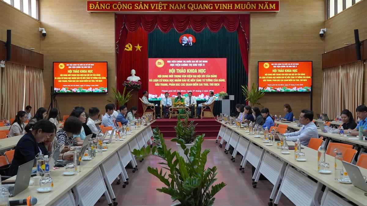 Phát biểu kết luận Hội thảo, TS. Lê Thị Anh Đào khẳng định, Hội thảo đã hoàn thành toàn bộ nội dung chương trình đề ra, đạt được nhiều kết quả quan trọng. Hội thảo đã làm rõ tầm vóc và những điểm mới đột phá trong Văn kiện Đại hội đại biểu toàn quốc lần thứ XIV của Đảng; khẳng định đây là sự phát triển sáng tạo chủ nghĩa Mác - Lênin, tư tưởng Hồ Chí Minh, đồng thời xác lập tầm nhìn phát triển đất nước trong “kỷ nguyên vươn mình của dân tộc” với mục tiêu trở thành nước phát triển, thu nhập cao vào năm 2045. TS. Lê Thị Anh Đào nhấn mạnh, Hội thảo đã xác lập hệ thống luận cứ khoa học để bảo vệ nền tảng tư tưởng của Đảng trong tình hình mới, nhấn mạnh rằng, việc bảo vệ nền tảng tư tưởng của Đảng phải dựa trên “sức mạnh của tri thức”, thông qua các lập luận khoa học chặt chẽ, có sức thuyết phục, góp phần phản bác hiệu quả các quan điểm sai trái, thù địch, nhất là trên không gian mạng. Hội thảo cũng làm rõ các đột phá về thể chế, công tác cán bộ và công bằng xã hội; đồng thời đề xuất nhiều giải pháp thiết thực nhằm đưa nội dung Văn kiện Đại hội đại biểu toàn quốc lần thứ XIV của Đảng vào công tác đào tạo, bồi dưỡng cán bộ tại Học viện Chính trị khu vực II.