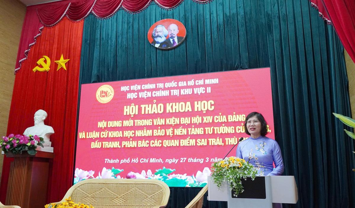 Phát biểu khai mạc và đề dẫn Hội thảo, PGS, TS. Nguyễn Thị Tuyết Mai khẳng định, Đại hội đại biểu toàn quốc lần thứ XIV của Đảng là sự kiện chính trị có ý nghĩa đặc biệt quan trọng, đánh dấu bước phát triển mới trong tư duy lý luận của Đảng, thể hiện tầm nhìn chiến lược trong định hướng phát triển đất nước đến năm 2045. Văn kiện Đại hội đại biểu toàn quốc lần thứ XIV của Đảng là sự kết tinh trí tuệ của toàn Đảng, toàn dân, đồng thời là sự phát triển sáng tạo chủ nghĩa Mác - Lênin, tư tưởng Hồ Chí Minh trong điều kiện mới. PGS, TS. Nguyễn Thị Tuyết Mai đề nghị các ý kiến, tham luận tập trung làm rõ những nội dung cơ bản sau: Thứ nhất,làm rõ tầm vóc, ý nghĩa và những nội dung mới trong Văn kiện Đại hội đại biểu toàn quốc lần thứ XIV của Đảng, đặc biệt là những nhận thức mới về chủ nghĩa xã hội và con đường đi lên chủ nghĩa xã hội ở Việt Nam; các định hướng lớn về phát triển kinh tế - xã hội, xây dựng Đảng, xây dựng Nhà nước pháp quyền xã hội chủ nghĩa, phát triển văn hóa, con người, bảo đảm quốc phòng, an ninh và đối ngoại trong bối cảnh mới; Thứ hai, nhận diện một cách hệ thống các quan điểm sai trái, thù địch, các luận điệu xuyên tạc liên quan đến Văn kiện Đại hội đại biểu toàn quốc lần thứ XIV của Đảng, nhất là những biểu hiện phủ nhận vai trò lãnh đạo của Đảng, xuyên tạc mô hình phát triển, lợi dụng các vấn đề dân chủ, nhân quyền, tôn giáo nhằm chống phá Đảng và Nhà nước ta, đặc biệt trên không gian mạng; Thứ ba, xây dựng hệ thống luận cứ khoa học vững chắc để bảo vệ nền tảng tư tưởng của Đảng, dựa trên cơ sở lý luận của chủ nghĩa Mác - Lênin, tư tưởng Hồ Chí Minh và thực tiễn sinh động của cách mạng Việt Nam; bảo đảm các lập luận có tính logic, thuyết phục, đủ sức phản bác hiệu quả các quan điểm sai trái, thù địch; Thứ tư, đề xuất các giải pháp đổi mới nội dung, phương thức bảo vệ nền tảng tư tưởng của Đảng trong tình hình mới, trong đó nhấn mạnh yêu cầu chủ động “tấn công bằng tri thức”, tận dụng hiệu quả không gian mạng, nâng cao chất lượng truyền thông lý luận chính trị; Thứ năm, tăng cường vận dụng các nội dung mới của Văn kiện Đại hội đại biểu toàn quốc lần thứ XIV của Đảng vào công tác giảng dạy, nghiên cứu tại Học viện Chính trị khu vực II, bảo đảm tính cập nhật, sinh động, gắn với thực tiễn, qua đó nâng cao chất lượng đào tạo, bồi dưỡng cán bộ. PGS, TS. Nguyễn Thị Tuyết Mai khẳng định, nghiên cứu Văn kiện Đại hội đại biểu toàn quốc lần thứ XIVcủa Đảng không chỉ là nhiệm vụ học thuật mà còn là nhiệm vụ chính trị cấp thiết; đội ngũ giảng viên, nhà khoa học cần phát huy vai trò là lực lượng xung kích trên mặt trận tư tưởng, góp phần trực tiếp vào công cuộc bảo vệ nền tảng tư tưởng của Đảng trong bối cảnh hiện nay.