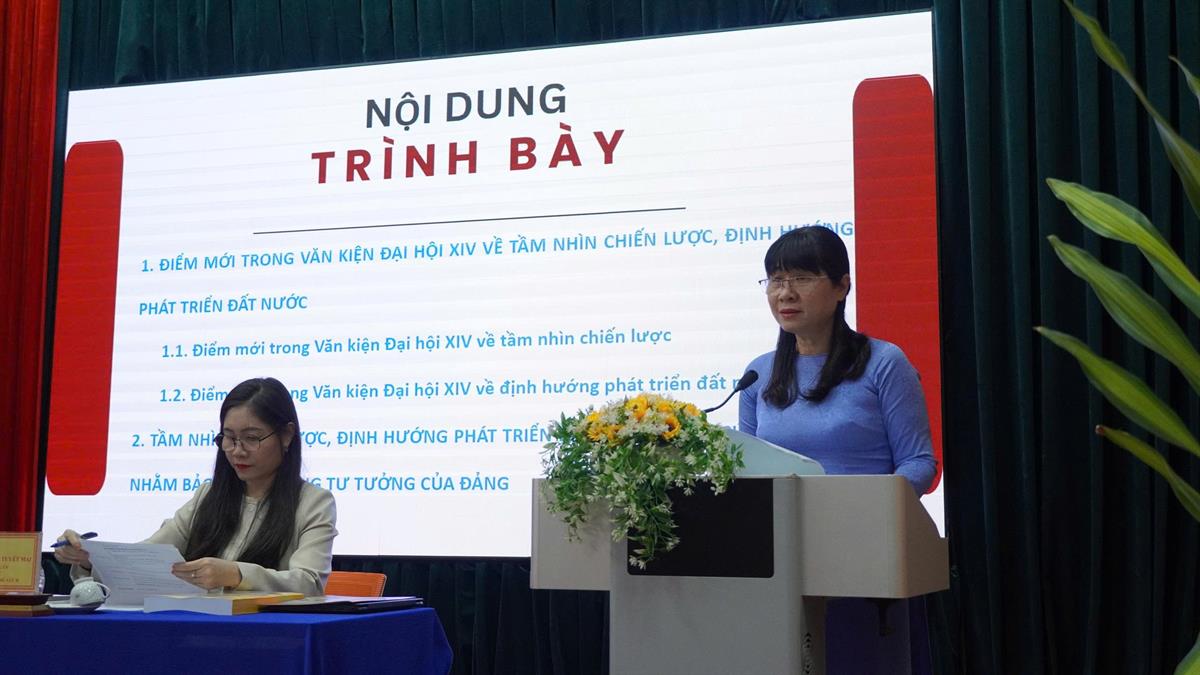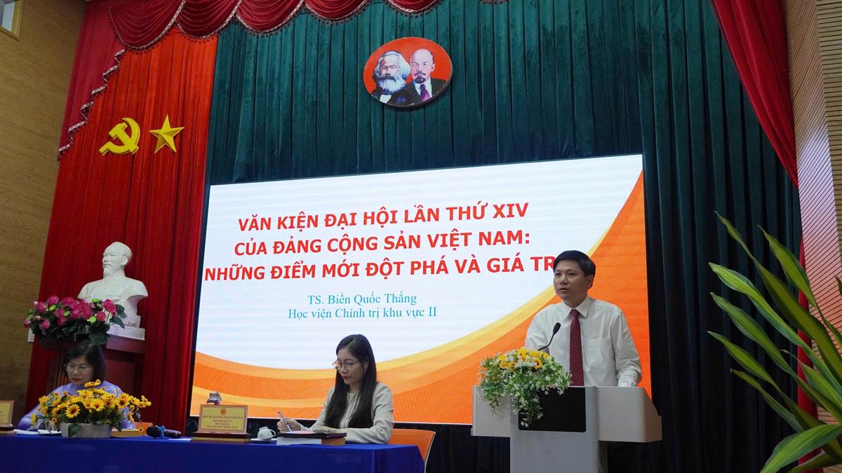 Tại Hội thảo, các đại biểu đã trình bày và trao đổi nhiều tham luận có giá trị, tập trung vào các vấn đề cốt lõi như: Tầm nhìn chiến lược, định hướng phát triển đất nước của Đại hội XIV - Luận cứ khoa học nhằm bảo vệ nền tảng tư tưởng của Đảng; Văn kiện Đại hội XIV của Đảng Cộng sản Việt Nam: Những điểm mới đột phá và giá trị; Bàn về bảo vệ nền tảng tư tưởng của Đảng, đấu tranh, phản bác các quan điểm sai trái, thù địch về Văn kiện Đại hội XIV của Đảng.