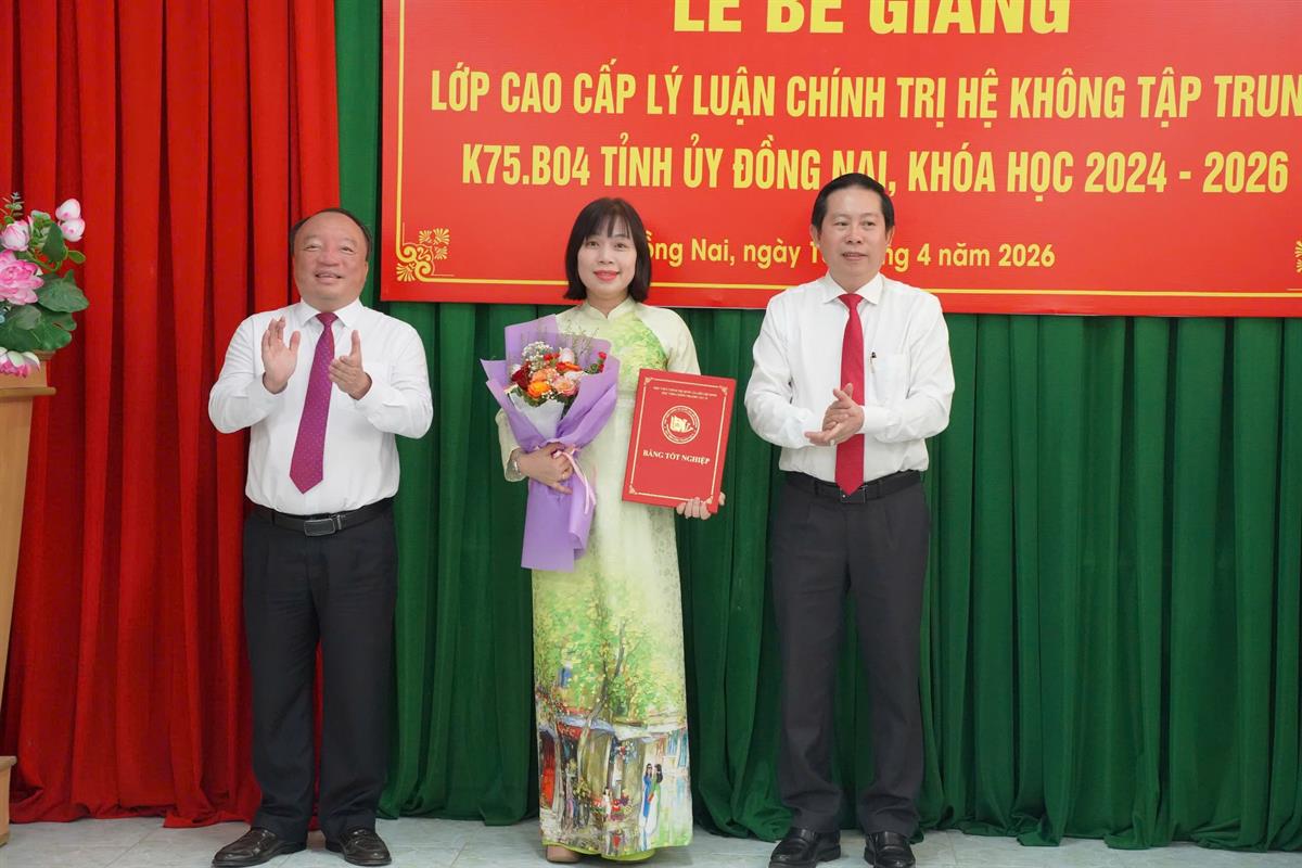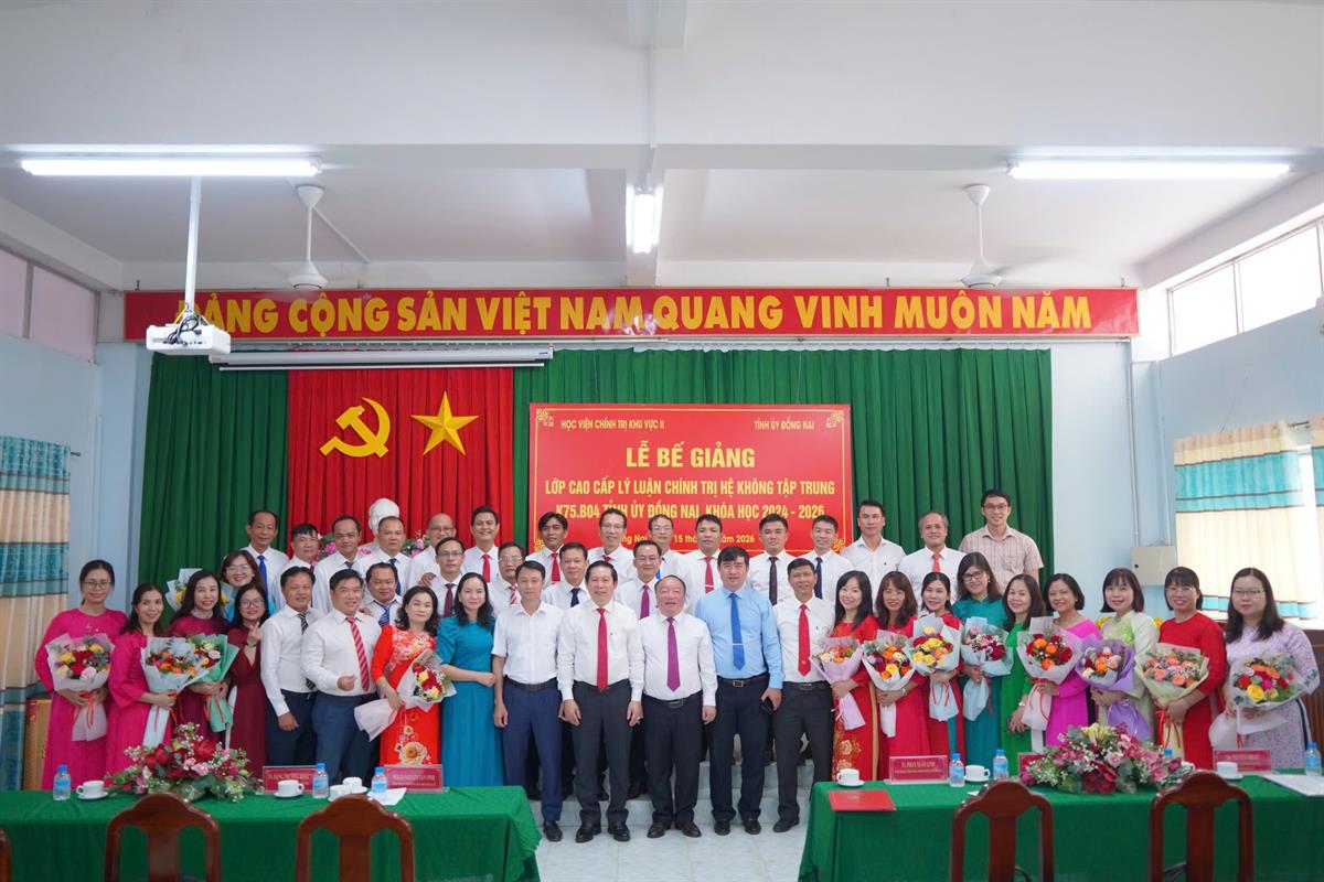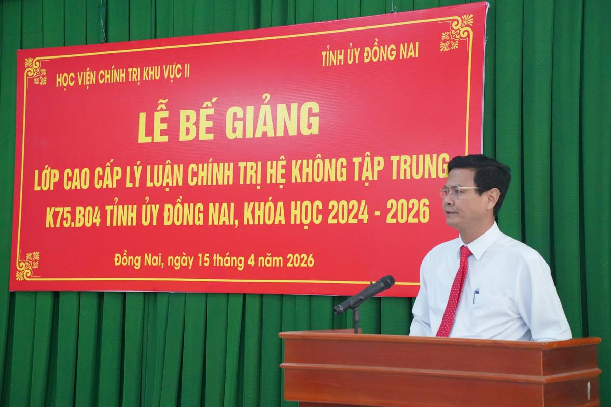 Phát biểu tại Lễ bế giảng, PGS, TS. Nguyễn Tấn Vinh nhấn mạnh, lớp Cao cấp Lý luận Chính trị K75.B04, Tỉnh ủy Đồng Nai, khóa học 2024 - 2026 được tổ chức trong bối cảnh toàn Đảng, toàn dân đang nỗ lực triển khai thực hiện Nghị quyết Đại hội đại biểu toàn quốc lần thứ XIII của Đảng, đồng thời tích cực chuẩn bị các điều kiện cho Đại hội đại biểu toàn quốc lần thứ XIV của Đảng. Đây cũng là giai đoạn hệ thống chính trị tập trung đẩy mạnh đổi mới, sắp xếp tổ chức bộ máy theo hướng “tinh - gọn - mạnh - hiệu năng - hiệu lực - hiệu quả” theo tinh thần các nghị quyết của Trung ương. Sau 18 tháng học tập và rèn luyện, mặc dù đa số học viên là cán bộ chủ chốt, cán bộ trong diện quy hoạch, chịu áp lực lớn trong việc cân đối giữa nhiệm vụ công tác và học tập, song với tinh thần trách nhiệm cao, toàn khóa đã hoàn thành chương trình với 19 môn học và kỳ thi tốt nghiệp đạt kết quả đáng ghi nhận. Cụ thể: 100% học viên được cấp bằng tốt nghiệp, trong đó 11,11% đạt loại Giỏi và 88,89% đạt loại Khá. Kết quả này không chỉ phản ánh sự nỗ lực, cố gắng của từng cá nhân học viên mà còn khẳng định tính đúng đắn, hiệu quả của phương châm đào tạo gắn lý luận với thực tiễn mà Học viện Chính trị khu vực II kiên trì thực hiện. PGS, TS. Nguyễn Tấn Vinh đề nghị, các học viên sau khi trở về đơn vị công tác cần tiếp tục phát huy kết quả đạt được, tập trung thực hiện tốt một số định hướng trọng tâm: Thứ nhất, vận dụng sáng tạo hệ thống tri thức lý luận về chủ nghĩa Mác - Lênin, tư tưởng Hồ Chí Minh và đường lối của Đảng vào thực tiễn nhằm giải quyết hiệu quả các vấn đề đặt ra, nhất là các “điểm nghẽn” trong phát triển ở địa phương, cơ quan, đơn vị; Thứ hai, giữ vững bản lĩnh chính trị, phẩm chất đạo đức cách mạng, kiên định mục tiêu độc lập dân tộc và chủ nghĩa xã hội, chủ động tham gia bảo vệ nền tảng tư tưởng của Đảng, đấu tranh phản bác các quan điểm sai trái, thù địch theo tinh thần Nghị quyết số 35-NQ/TW ngày 22/10/2018 của Bộ Chính trị về tăng cường bảo vệ nền tảng tư tưởng của Đảng, đấu tranh phản bác các quan điểm sai trái, thù địch trong tình hình mới; Thứ ba, với vai trò là đội ngũ cán bộ nòng cốt, cần tiên phong trong thực hiện chủ trương đổi mới, sắp xếp tổ chức bộ máy theo hướng tinh gọn, hiệu lực, hiệu quả; Thứ tư, xác định rõ yêu cầu học tập suốt đời, thường xuyên cập nhật tri thức mới, duy trì mối liên hệ chặt chẽ với các cơ sở đào tạo lý luận chính trị để tiếp tục trao đổi, bổ sung và hoàn thiện năng lực công tác trong bối cảnh mới.