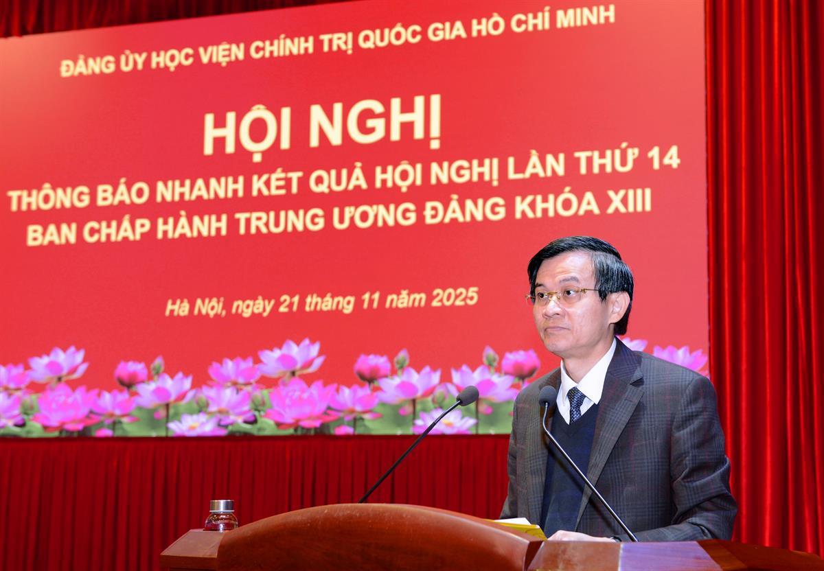 hcma.vn - Sáng 21/11/2025, Ban Thường vụ Đảng ủy Học viện tổ chức Hội nghị thông báo nhanh kết quả Hội nghị lần thứ 14 Ban Chấp hành Trung ương Đảng khóa XIII. PGS,TS Đoàn Minh Huấn, Ủy viên Ban Chấp hành Trung ương Đảng, Phó Bí thư thường trực Đảng ủy, Phó Giám đốc thường trực Học viện dự và báo cáo tại hội nghị.